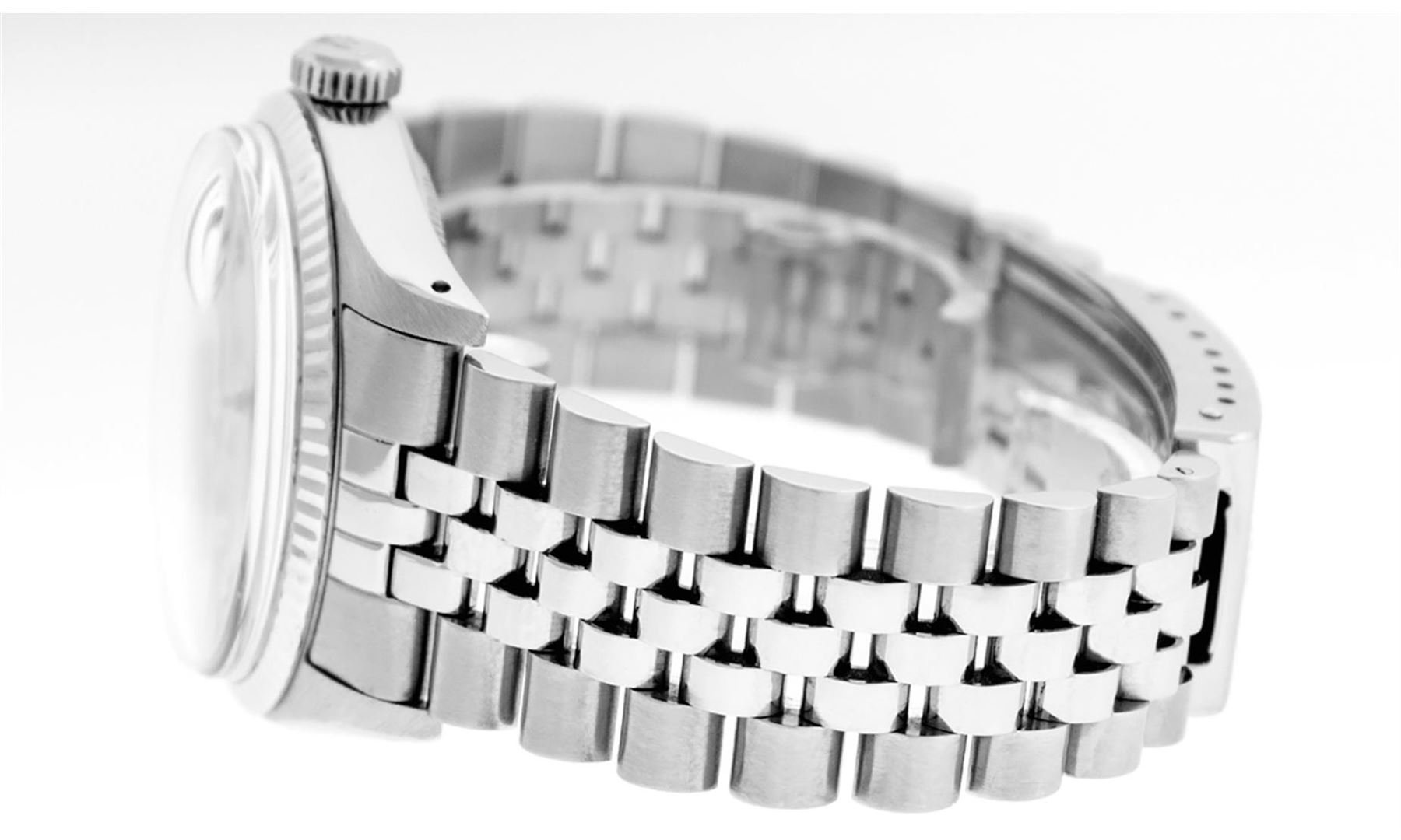 One Mens Rolex Datejust Polished Bright with Satin Finish, Serviced & Electronically Tested, Stainless Steel Case: 36mm, Stainless Steel Crown, Bezel: 14K White Gold Fluted Bezel. Custom Crystal: New Acrylic Cyclops Lens. Custom Hands: New Luminescent Hands. Movement: Automatic Winding Movement Caliber 3035. Custom Dial: Black Baguette Diamond 8 + 2 Synthetic Emerald Dial, Stone Count: 8 Baguette Diamonds in Dial + 2 Synthetic Emerald Baguettes, G To H In Color, Si-VS Clarity. Date Window: 3 O'Clock Position Date Display, Quickset, Model: Datejust, Condition: G-6 Extra Fine. Bracelet: Stainless Steel Jubilee. Bright Polish & Satin Finish. 7.0 Inch Length, Adjustable. Standard Clasp, With Rolex Logo. Watch Has Been Serviced And Polished It Is Free Of All Scratches And Dents.