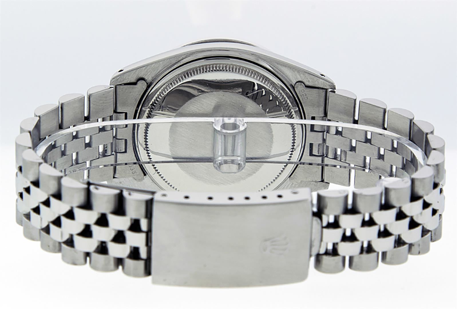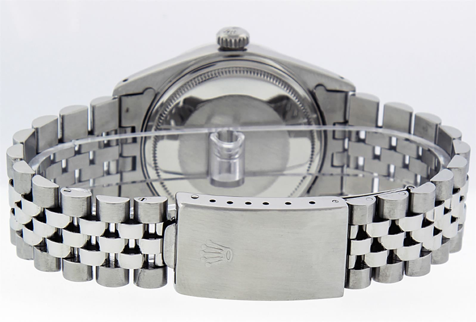 One Men's Rolex Datejust Polished, Serviced & Electronically Tested, Stainless Steel Case: 36mm, Stainless Steel Crown, Custom Bezel: 18K White Gold Emerald Beadset Diamond Bezel, Diamond + Gem Count: 36 Diamonds + 4 Synthetic Emeralds, Total Weight 1.00 Carat, Clarity: SI-VS, Color: G to H. Custom Crystal: New Synthetic Sapphire Cyclops Lens. Custom Hands: New Luminescent Hands. Movement: Automatic Winding Movement.. Custom Dial: Green Vignette With Diamond Hour Markers, 10 Diamonds In Dial G To H In Color, Clarity: SI-VS. Date Window: 3 O'clock Position Date Display, Quickset, Model: Datejust. Condition: G-6 Extra Fine. Bracelet: Stainless Steel Jubilee. Bright Polish & Satin Finish. 7.0 Inch Length, Adjustable. Standard Clasp, With Rolex Logo. This Watch Has Been Serviced Time Tested And Is In Excellent Condition It Is Free Of All Scratches And Dents.