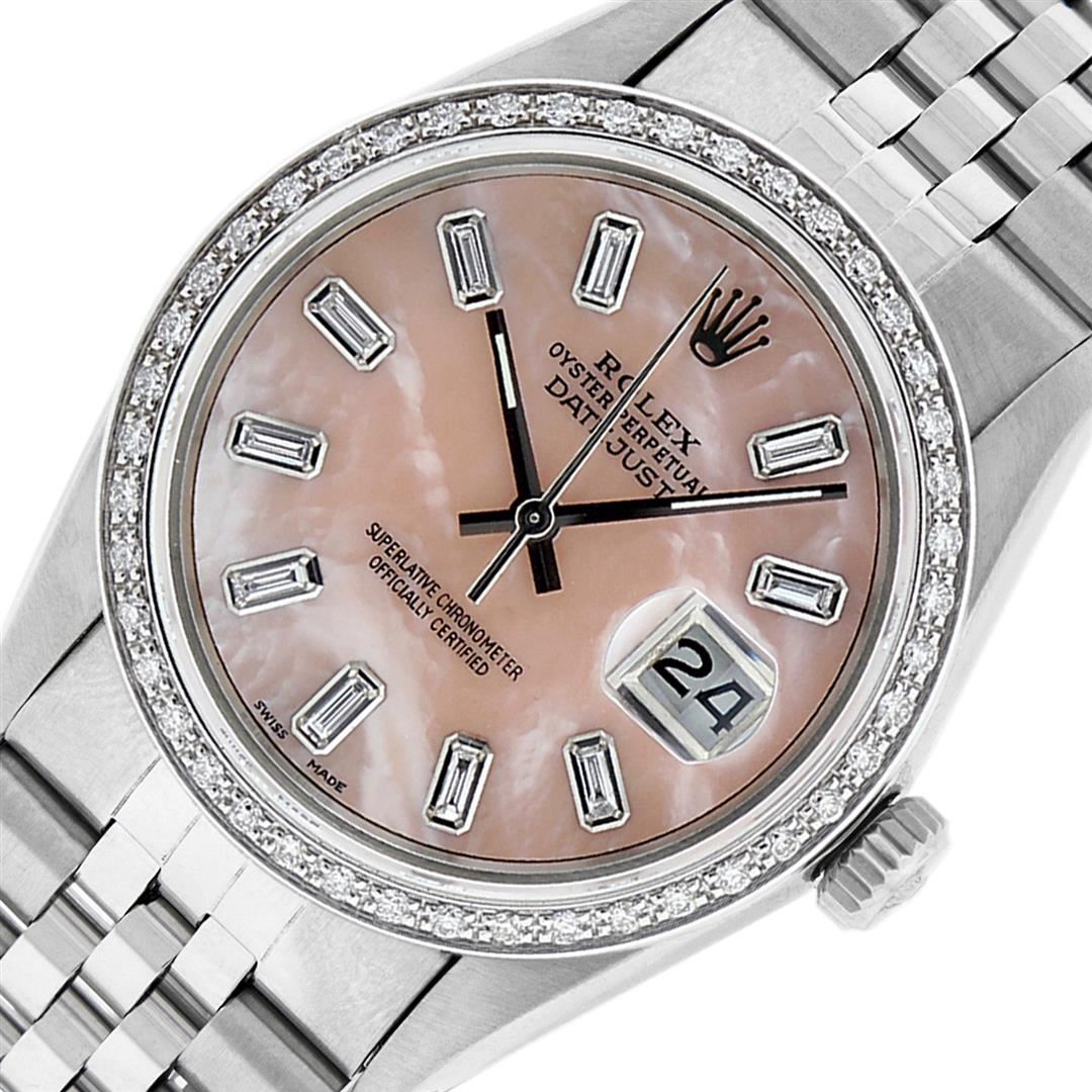 One Men's Stainless Steel Rolex Datejust Polished, Serviced & Electronically Tested, Stainless Steel Case: 36mm, Stainless Steel Crown, New Custom Bezel: 18K White Gold Beadset Diamond Bezel, Diamond Count: 44 Diamonds. Total Weight 1.00 Carat, Clarity: SI-VS, Color: G to H. Custom Crystal: New Scratch Resistant Synthetic Sapphire Cyclops Lens. Custom Hands: New Luminescent Hands. Movement: Automatic Winding Movement.. Custom Dial: Light Pink Mother Of Pearl With Baguette Diamond Hour Markers, Stone Count: 10 Diamond Baguettes In Dial. G To H In Color, Clarity: SI-VS. Date Window: 3 O'clock Position Date Display, Quickset, Model: Datejust. Condition: G-6 Extra Fine. Bracelet: Stainless Steel Jubilee. Bright Polish & Satin Finish. 7.0 Inch Length, Adjustable. Standard Clasp, With Rolex Logo. This Watch Has Been Serviced Time Tested And Is In Excellent Condition It Is Free Of All Scratches And Dents.