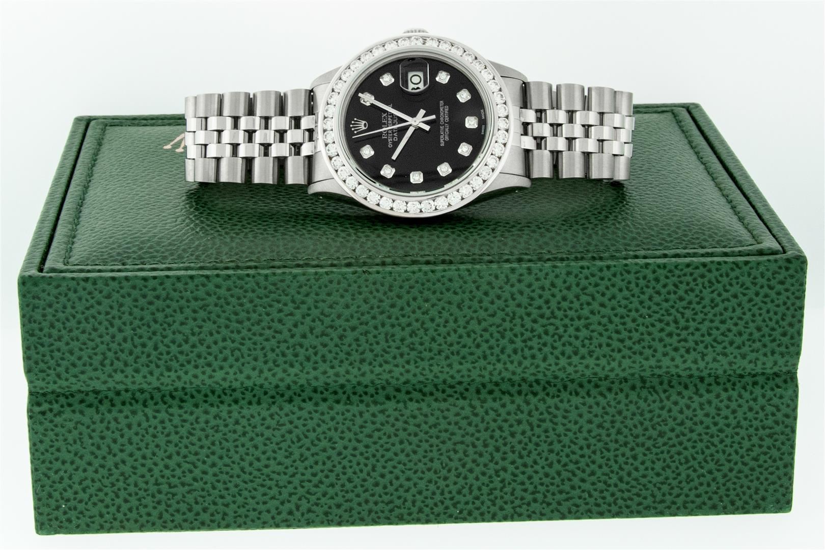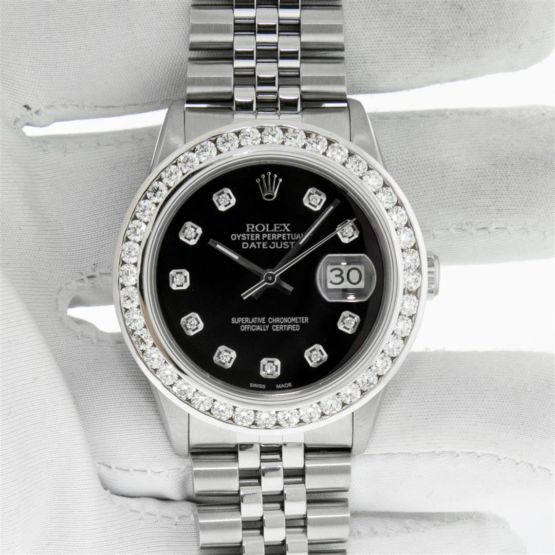 One Mens Stainless Steel Rolex Datejust Polished Bright with Satin Finish, Fully Serviced & Electronically Tested, Stainless Steel Case: 36mm, Rolex Stainless Steel Crown, Custom Bezel: New 18K White Gold 3.00 Ctw Diamond Bezel, Diamond Count: 40 Diamonds, Total Weight 3.0 Carat, Clarity: SI-VS, Color: G to H. Custom Crystal: New Sapphire With Magnified Date Window. Custom Hands: New Luminescent Hands. Rolex Movement: Automatic Winding Movement. Custom Dial: Refinished To Black With Added Diamond Hour Markers, 10 Diamonds in Dial, G To H In Color, Clarity: SI-VS. Date Window: 3 O'Clock Position Date Display, Quickset, Model: Datejust 36mm, Condition: G-6 Extra Fine. Rolex Bracelet: Rolex Stainless Steel Jubilee Band. Bright Polish & Satin Finish. 7.0 Inch Length, Adjustable. Standard Clasp, With Rolex Logo. This Pre Owned Watch Has Been Serviced And Polished It Is Free Of All Scratches And Dents.