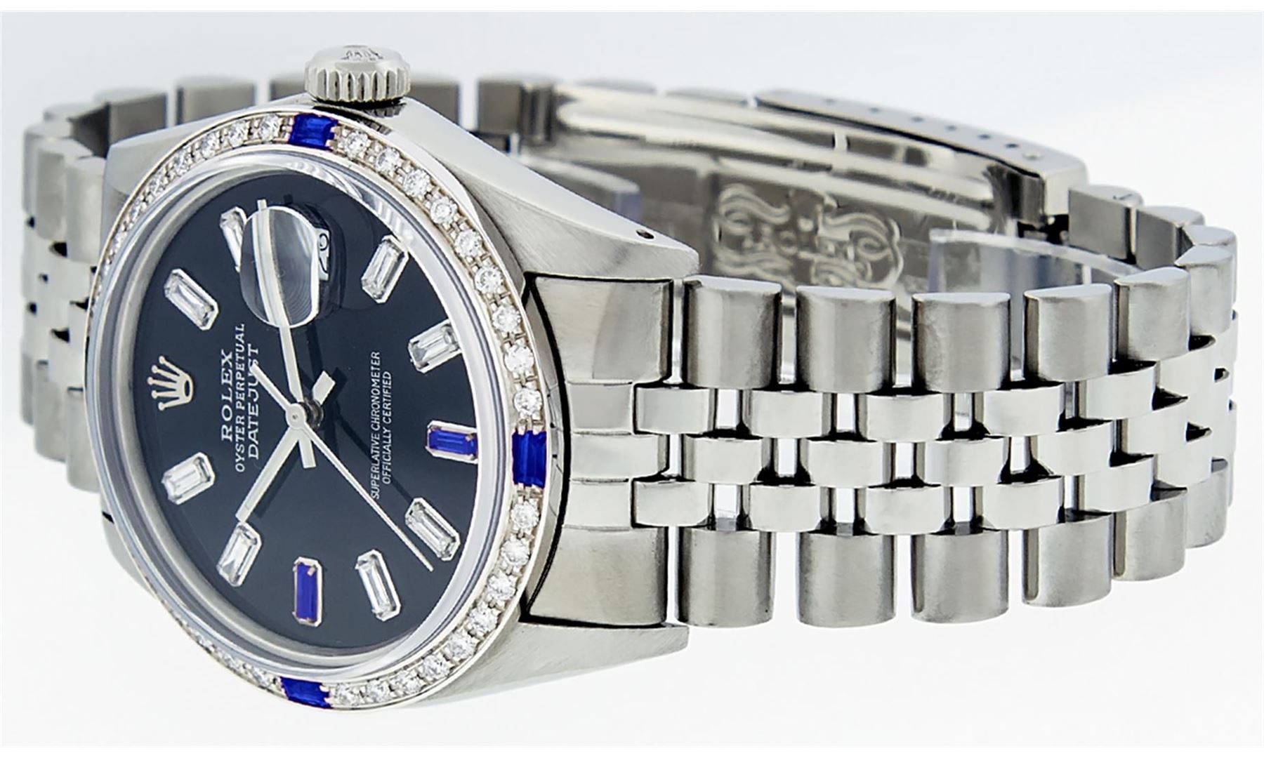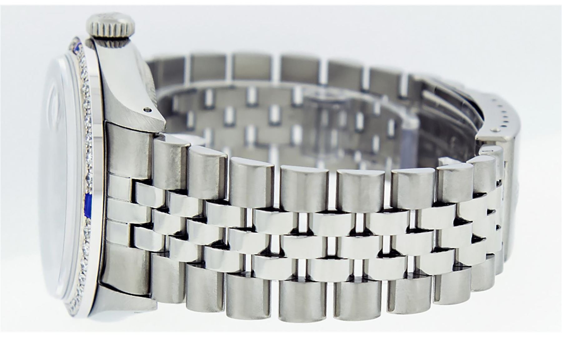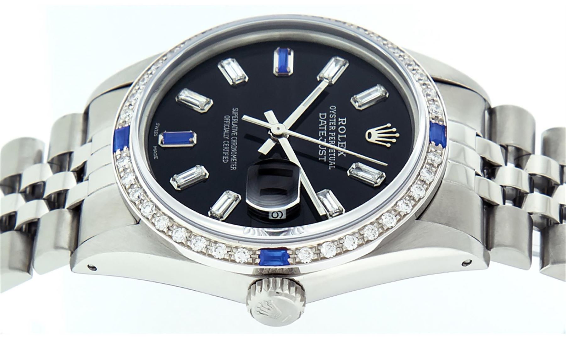 One Mens Stainless Steel Rolex Datejust Polished, Serviced & Electronically Tested, Stainless Steel Case: 36mm, Stainless Steel Crown, New Custom Bezel: 18K White Gold Sapphire Beadset Diamond Bezel, Diamond + Gem Count: 36 Diamonds + 4 Sapphires. Total Weight 1.00 Carat, Clarity: SI-VS, Color: G to H. Custom Crystal: New Synthetic Sapphire Cyclops Lens. Custom Hands: New Luminescent Hands. Movement: Automatic Winding Movement Caliber 3035. Custom Dial: Black Baguette + 2 Synthetic Sapphire Baguette Diamond Hour Markers, Stone Count: 8 Diamonds + 2 Synthetic Sapphire Baguettes. G To H In Color, Clarity: SI-VS. Date Window: 3 O'Clock Position Date Display, Quickset, Model: Datejust. Condition: G-6 Extra Fine. Bracelet: Stainless Steel Jubilee. Bright Polish & Satin Finish. 7.0 Inch Length, Adjustable. Standard Clasp, With Rolex Logo. This Watch Has Been Serviced Time Tested And Is In Excellent Condition It Is Free Of All Scratches And Dents.