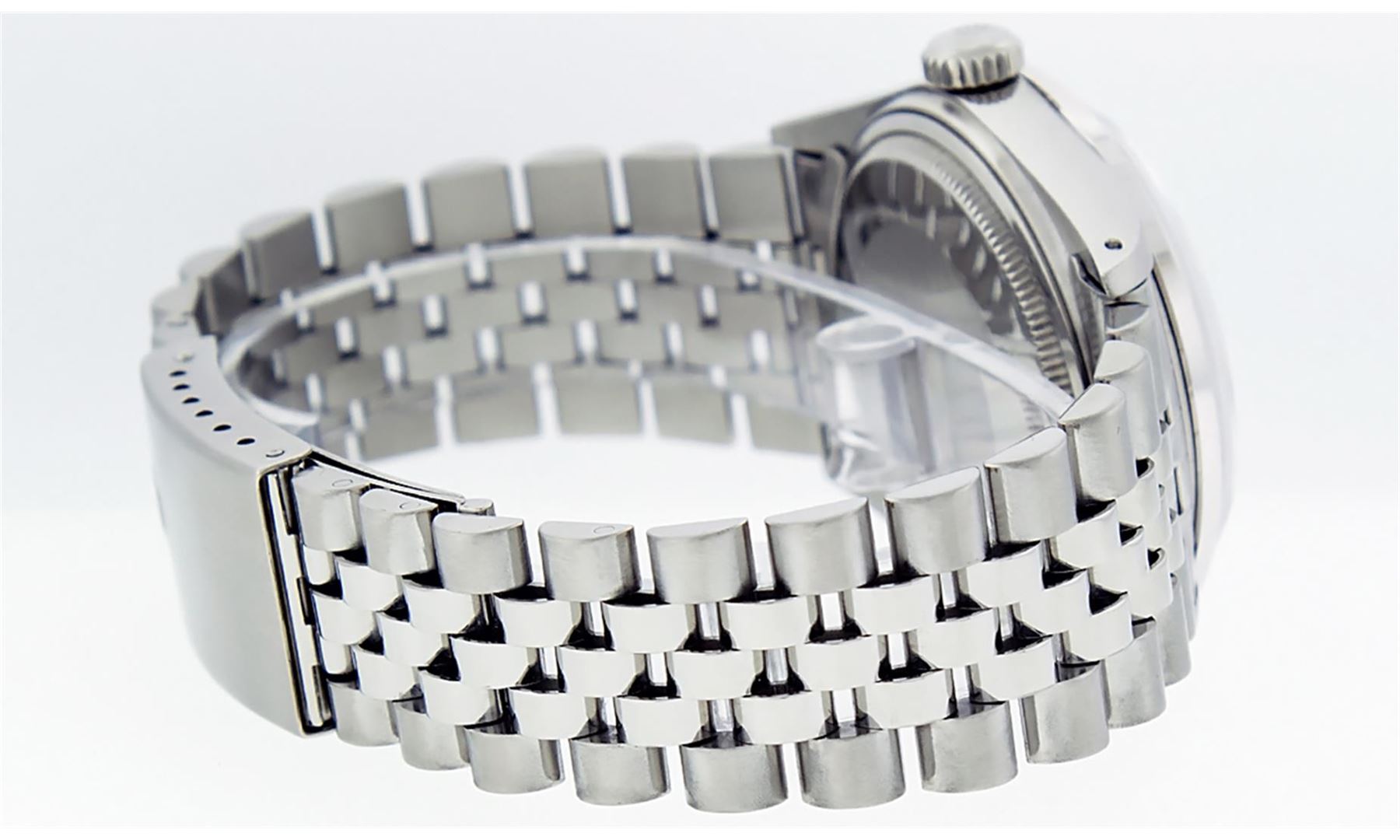 One Mens Stainless Steel Rolex Datejust Polished, Serviced & Electronically Tested, Stainless Steel Case: 36mm, Stainless Steel Crown, New Custom Bezel: 18K White Gold Sapphire Beadset Diamond Bezel, Diamond + Gem Count: 36 Diamonds + 4 Sapphires. Total Weight 1.00 Carat, Clarity: SI-VS, Color: G to H. Custom Crystal: New Synthetic Sapphire Cyclops Lens. Custom Hands: New Luminescent Hands. Movement: Automatic Winding Movement Caliber 3035. Custom Dial: Black Baguette + 2 Synthetic Sapphire Baguette Diamond Hour Markers, Stone Count: 8 Diamonds + 2 Synthetic Sapphire Baguettes. G To H In Color, Clarity: SI-VS. Date Window: 3 O'Clock Position Date Display, Quickset, Model: Datejust. Condition: G-6 Extra Fine. Bracelet: Stainless Steel Jubilee. Bright Polish & Satin Finish. 7.0 Inch Length, Adjustable. Standard Clasp, With Rolex Logo. This Watch Has Been Serviced Time Tested And Is In Excellent Condition It Is Free Of All Scratches And Dents.