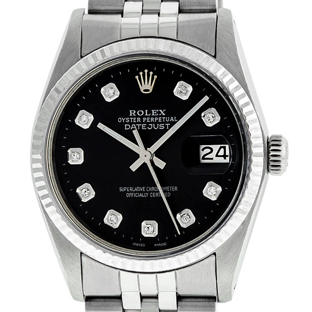 One Men's Stainless Steel Rolex Datejust Polished Bright with Satin Finish, This Watch Has Been Serviced & Electronically Tested, Stainless Steel Case: 36mm, Stainless Steel Crown, Original Bezel: 14K White Gold Fluted Bezel. Custom Crystal: New Acrylic Cyclops Lens. Custom Hands: New Luminescent Hands. Movement: Automatic Winding Movement Caliber 3035. Custom Dial: Black Diamond Dial With Diamond Hour Markers, Diamond Count: 10 Diamonds in Dial G To H In Color, SI-VS Clarity. Date Window: 3 O'clock Position Date Display, Quickset, Model: Datejust, Condition: G-6 Extra Fine. Bracelet: Stainless Steel Jubilee. Bright Polish & Satin Finish. 7.0 Inch Length, Adjustable. Standard Clasp, With Rolex Logo. This Watch Has Been Serviced Time Tested And Is In Excellent Condition It Is Free Of All Scratches And Dents