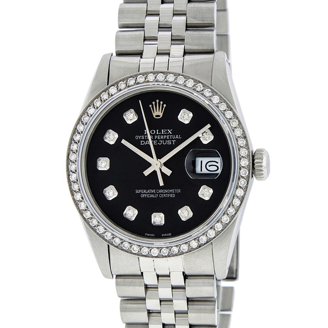 One Men's Rolex Stainless Steel Datejust Polished Bright with Satin Finish, This Watch Has Been Serviced & Electronically Tested, Stainless Steel Case: 36mm, Stainless Steel Crown, Custom Bezel: New Stainless Steel Beadset Diamond Bezel, Diamond Count: 54 Diamonds In Bezel, Total Weight 1.00 Carat, Clarity: SI-VS, Color: G to H. Custom Crystal: New Synthetic Sapphire Cyclops Lens. Custom Hands: New Luminescent Hands. Movement: Automatic Winding Movement Caliber 3035. Custom Dial: Black Diamond Dial, Diamond Count: 10 Diamonds In Dial, Color: G to H, Clarity: VS2-SI1. Date Window: 3 O'clock Position Date Display, Quickset, Model: Datejust. Condition: G-6 Extra Fine. Bracelet: Stainless Steel Jubilee Band. Bright Polish & Satin Finish. 7.0 Inch Length, Adjustable. Standard Clasp, With Rolex Logo. This Watch Has Been Serviced Time Tested And Is In Excellent Condition It Is Free Of All Scratches And Dents.