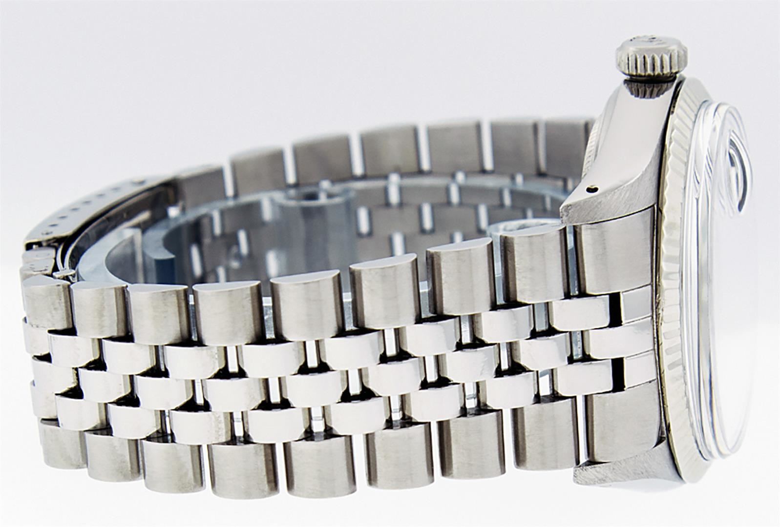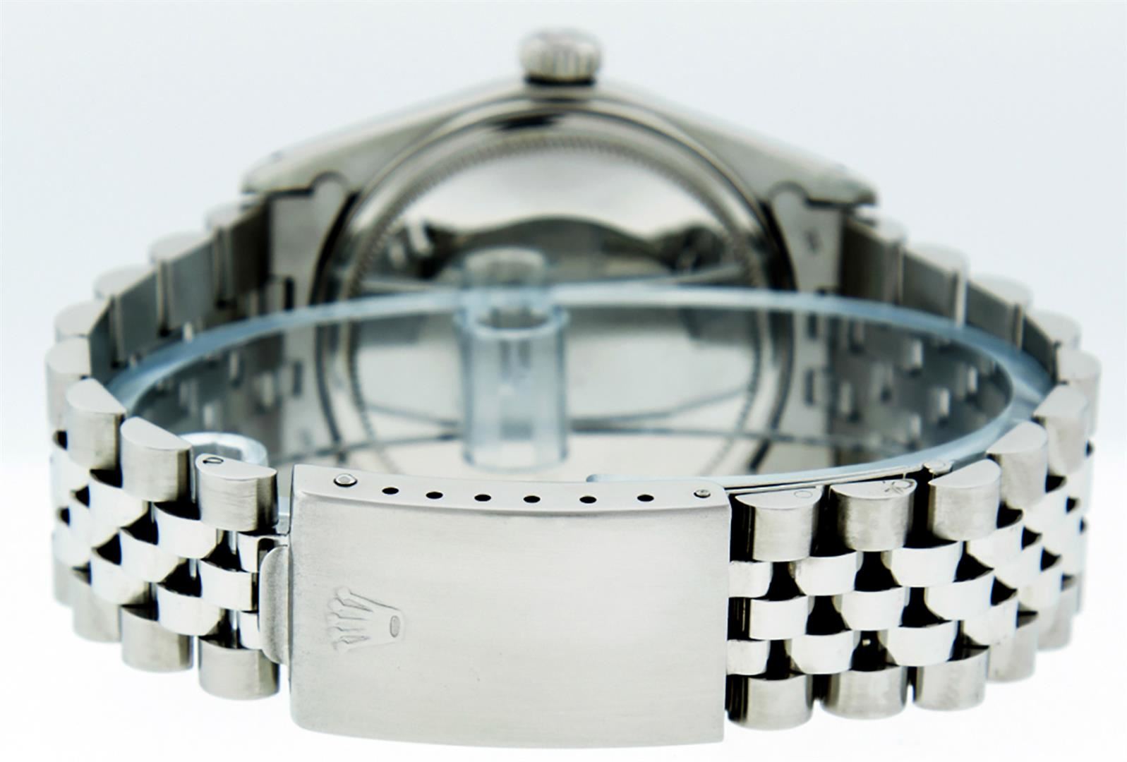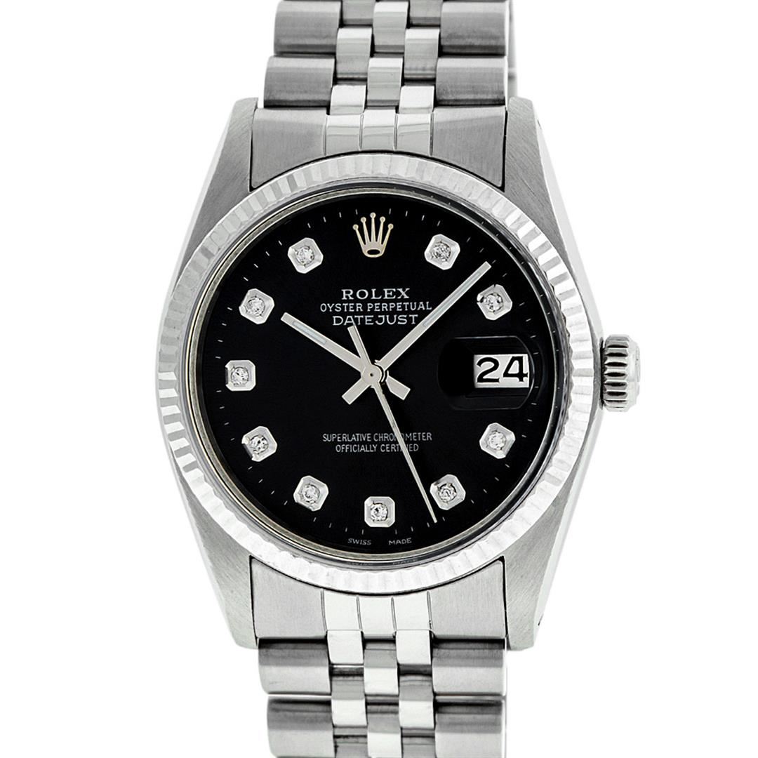 One Men's Stainless Steel Rolex Datejust Polished Bright with Satin Finish, This Watch Has Been Serviced & Electronically Tested, Stainless Steel Case: 36mm, Stainless Steel Crown, Original Bezel: 14K White Gold Fluted Bezel. Custom Crystal: New Acrylic Cyclops Lens. Custom Hands: New Luminescent Hands. Movement: Automatic Winding Movement Caliber 3035. Custom Dial: Black Diamond Dial With Diamond Hour Markers, Diamond Count: 10 Diamonds in Dial G To H In Color, SI-VS Clarity. Date Window: 3 O'clock Position Date Display, Quickset, Model: Datejust, Condition: G-6 Extra Fine. Bracelet: Stainless Steel Jubilee. Bright Polish & Satin Finish. 7.0 Inch Length, Adjustable. Standard Clasp, With Rolex Logo. This Watch Has Been Serviced Time Tested And Is In Excellent Condition It Is Free Of All Scratches And Dents
