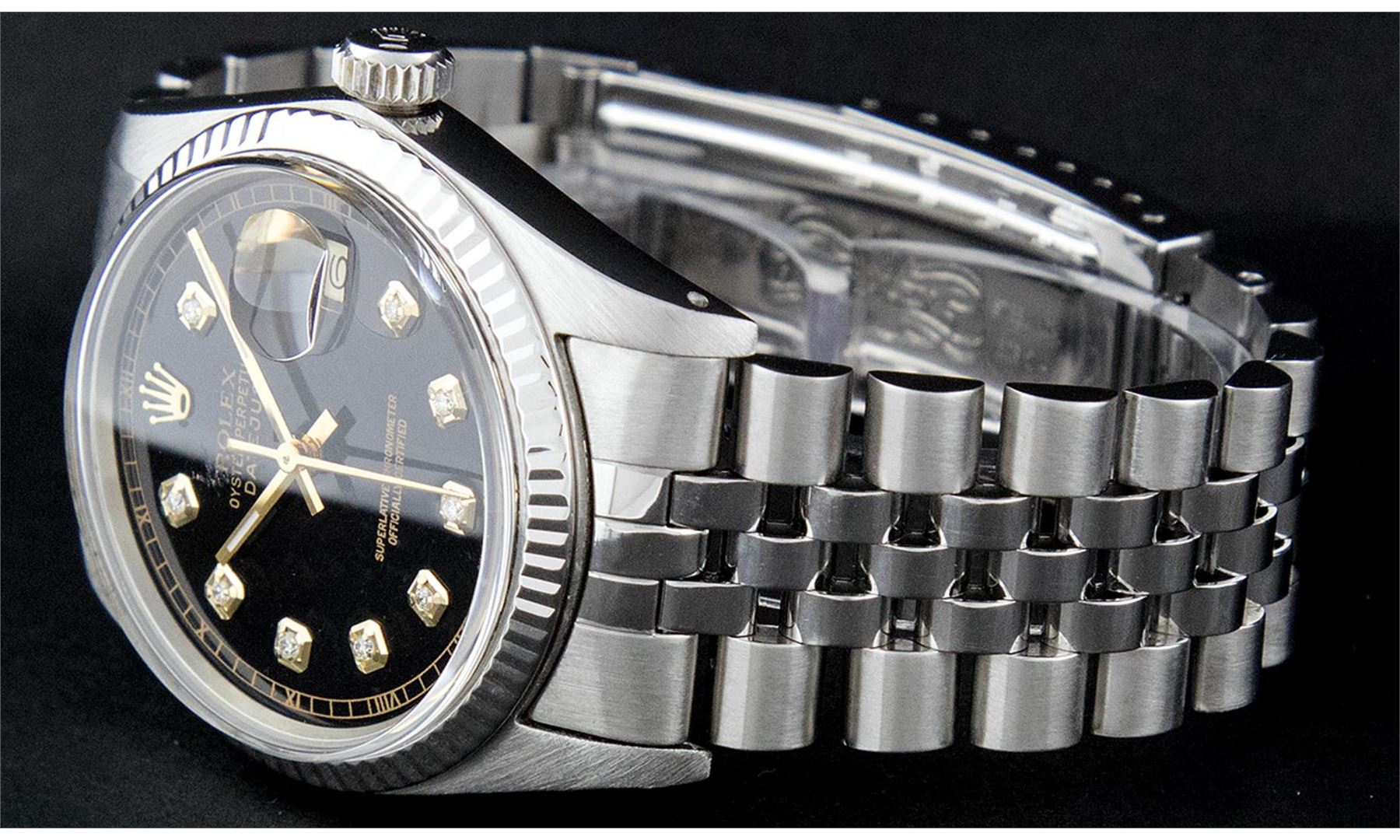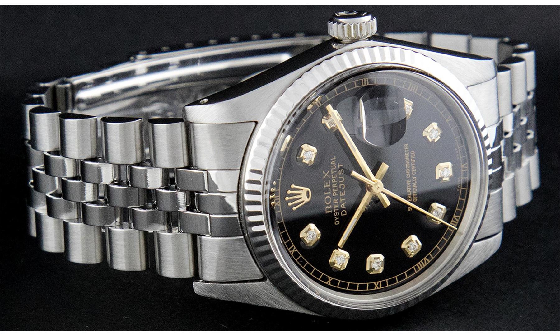 One Men's Stainless Steel Rolex Datejust Polished, Serviced & Electronically Tested, Stainless Steel Case: 36mm, Stainless Steel Crown, Original Bezel: 14K White Gold Fluted Bezel. Custom Crystal: New Acrylic Cyclops Lens. Custom Hands: New Luminescent Hands. Movement: Automatic Winding Movement Caliber. Custom Dial: Black Diamond Dial With Track, Diamond Count: 10 Diamonds, Clarity: SI-VS, Color: G to H. Date Window: 3 O'Clock Position Date Display, Quickset, Model: Datejust. Condition: G-6 Extra Fine. Bracelet: Stainless Steel Jubilee. Bright Polish & Satin Finish. 7.0 Inch Length, Adjustable. Standard Clasp, With Rolex Logo. This Watch Has Been Serviced Time Tested And Is In Excellent Condition It Is Free Of All Scratches And Dents.