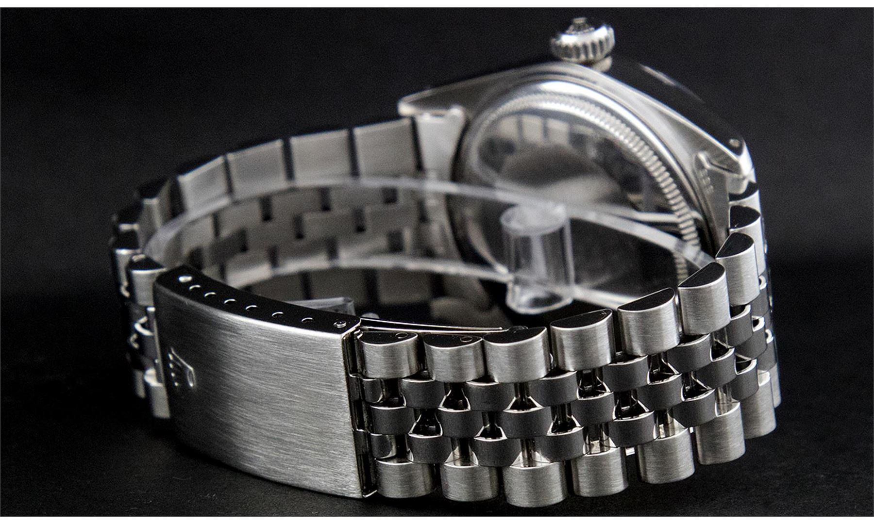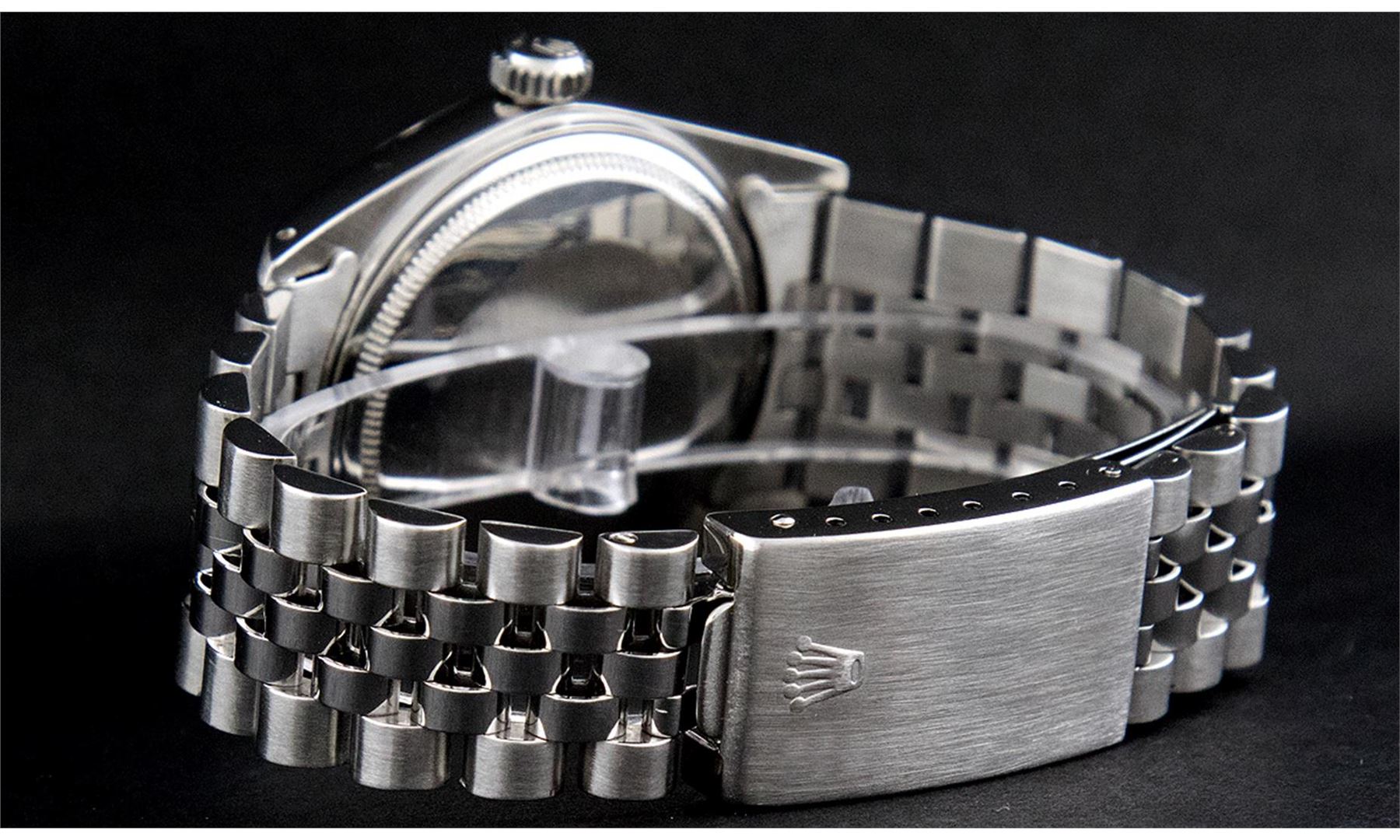 One Men's Stainless Steel Rolex Datejust Polished, Serviced & Electronically Tested, Stainless Steel Case: 36mm, Stainless Steel Crown, Original Bezel: 14K White Gold Fluted Bezel. Custom Crystal: New Acrylic Cyclops Lens. Custom Hands: New Luminescent Hands. Movement: Automatic Winding Movement Caliber. Custom Dial: Black Diamond Dial With Track, Diamond Count: 10 Diamonds, Clarity: SI-VS, Color: G to H. Date Window: 3 O'Clock Position Date Display, Quickset, Model: Datejust. Condition: G-6 Extra Fine. Bracelet: Stainless Steel Jubilee. Bright Polish & Satin Finish. 7.0 Inch Length, Adjustable. Standard Clasp, With Rolex Logo. This Watch Has Been Serviced Time Tested And Is In Excellent Condition It Is Free Of All Scratches And Dents.