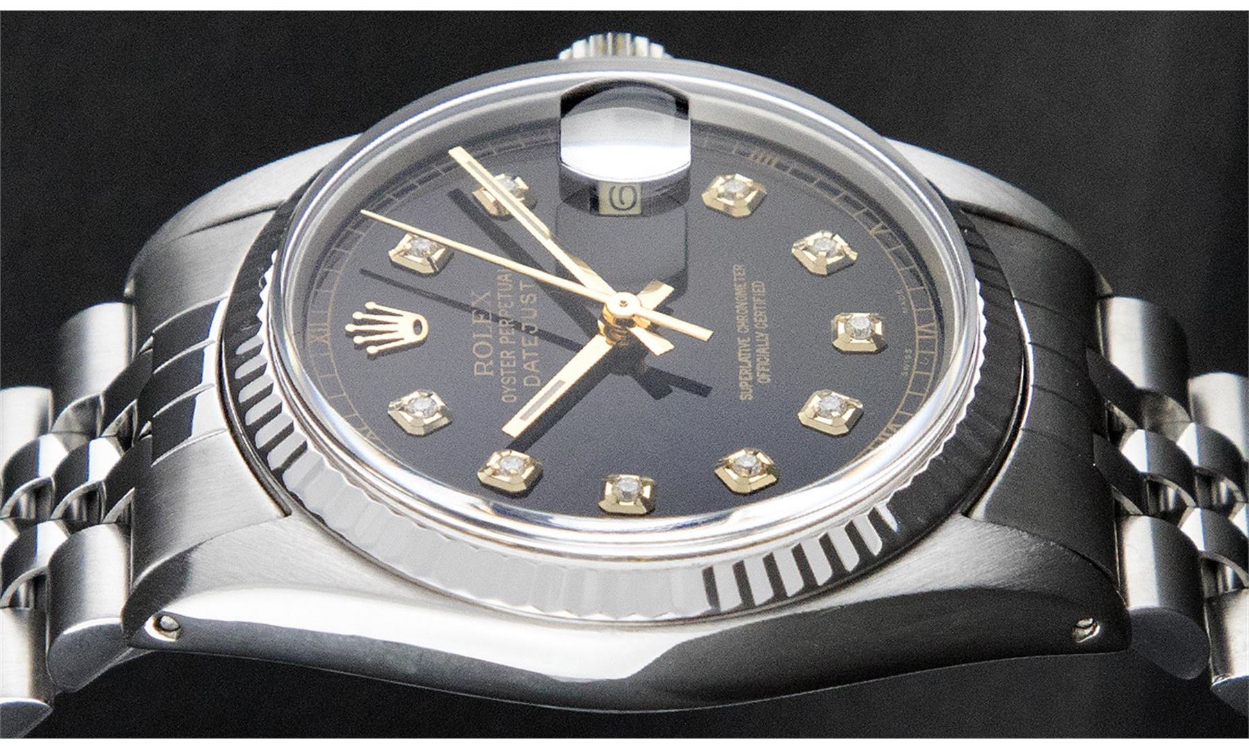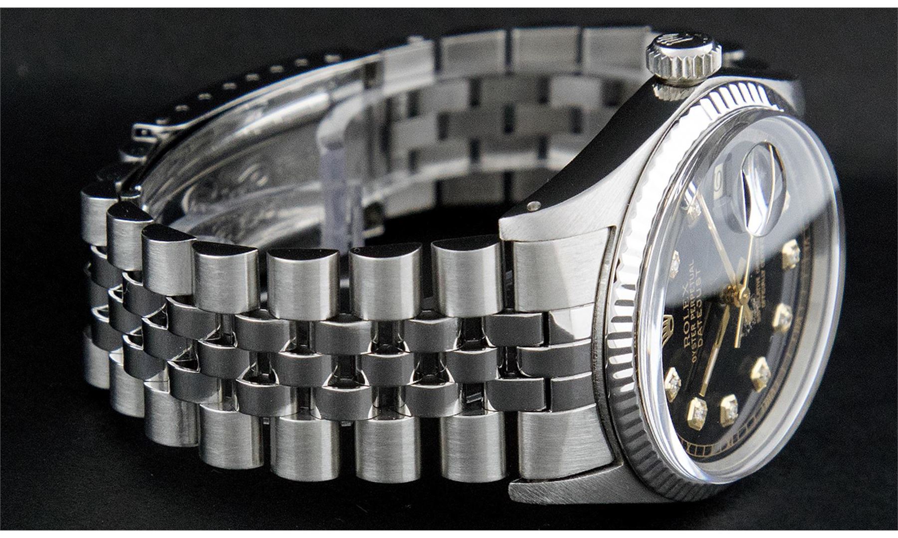 One Men's Stainless Steel Rolex Datejust Polished, Serviced & Electronically Tested, Stainless Steel Case: 36mm, Stainless Steel Crown, Original Bezel: 14K White Gold Fluted Bezel. Custom Crystal: New Acrylic Cyclops Lens. Custom Hands: New Luminescent Hands. Movement: Automatic Winding Movement Caliber. Custom Dial: Black Diamond Dial With Track, Diamond Count: 10 Diamonds, Clarity: SI-VS, Color: G to H. Date Window: 3 O'Clock Position Date Display, Quickset, Model: Datejust. Condition: G-6 Extra Fine. Bracelet: Stainless Steel Jubilee. Bright Polish & Satin Finish. 7.0 Inch Length, Adjustable. Standard Clasp, With Rolex Logo. This Watch Has Been Serviced Time Tested And Is In Excellent Condition It Is Free Of All Scratches And Dents.