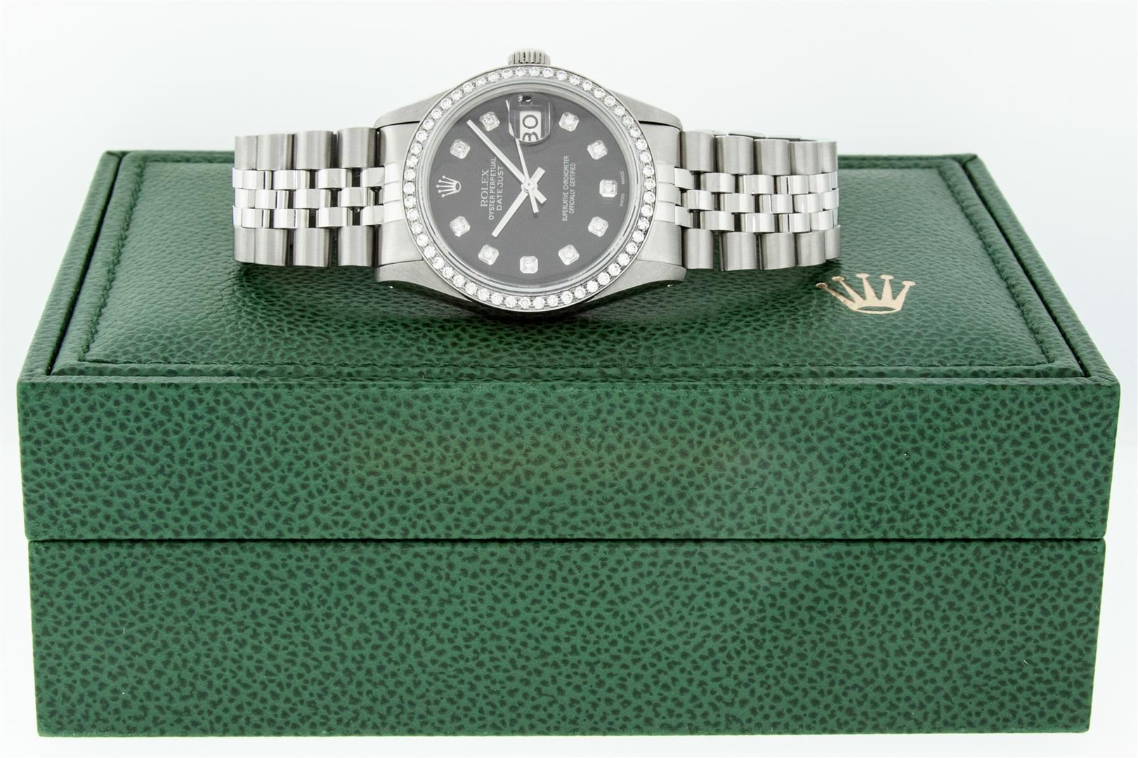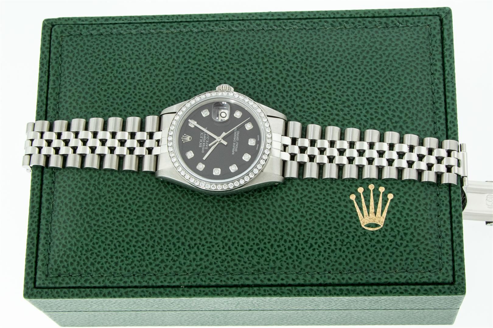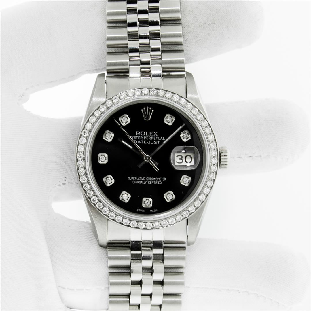 One Men's Rolex Stainless Steel Datejust Polished Bright with Satin Finish, This Watch Has Been Serviced & Electronically Tested, Rolex Stainless Steel Case: 36mm, Rolex Stainless Steel Crown, Custom Bezel: New Stainless Steel Beadset Diamond Bezel, Diamond Count: 54 Diamonds In Bezel, Total Weight 1.00 Carat, Clarity: SI-VS, Color: G to H. Custom Crystal: New Sapphire With Magnified Date Window. Custom Hands: New Luminescent Hands. Rolex Movement: Automatic Winding Movement. Custom Dial: Refinished To Black With Added Diamonds, Diamond Count: 10 Diamonds In Dial, Color: G to H, Clarity: VS2-SI1. Date Window: 3 O'clock Position Date Display, Quickset, Model: Datejust. Condition: G-6 Extra Fine. Rolex Bracelet: Stainless Steel Jubilee Band. Bright Polish & Satin Finish. 7.0 Inch Length, Adjustable. Standard Clasp, With Rolex Logo. This Pre Owned Watch Has Been Serviced Time Tested And Is In Excellent Condition It Is Free Of All Scratches And Dents. This Watch Comes With A Rolex Box.