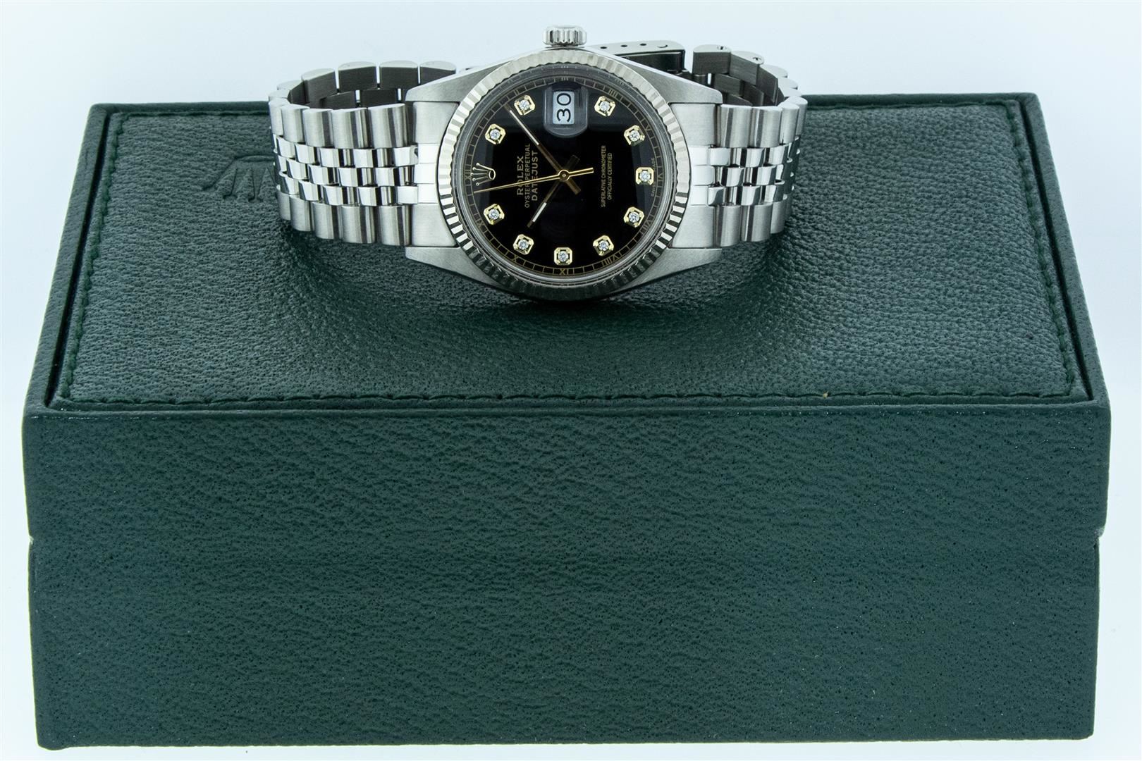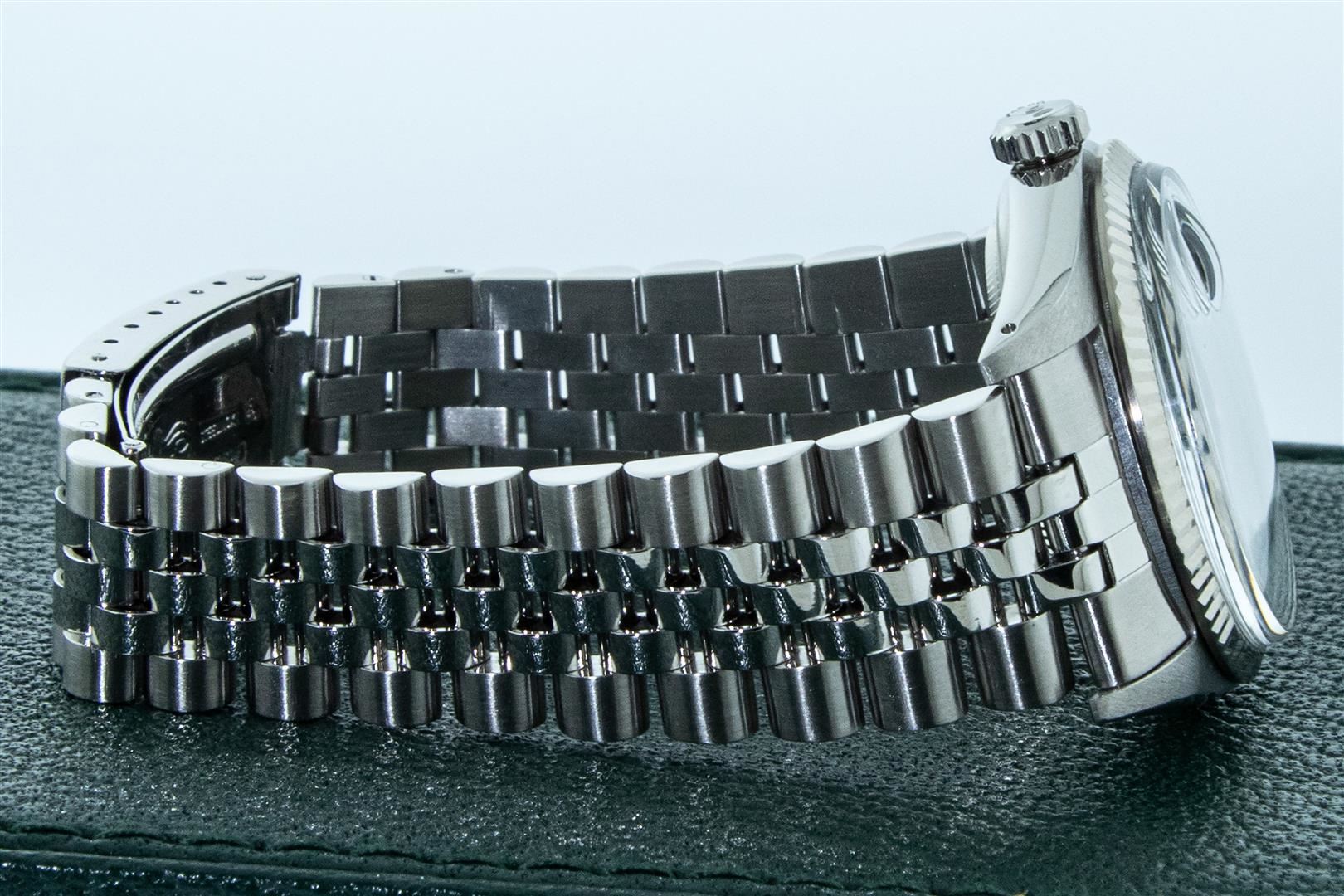 One Men's Stainless Steel Rolex Datejust Polished, Serviced & Electronically Tested, Rolex Stainless Steel Case: 36mm, Rolex Stainless Steel Crown, Rolex Bezel: 14K White Gold Fluted Bezel. Custom Crystal: New Acrylic With Magnified Date Window. Custom Hands: New Luminescent Hands. Rolex Movement: Automatic Winding Movement Caliber. Custom Dial: Refinished To Black With Added Diamonds, Diamond Count: 10 Diamonds, Clarity: SI-VS, Color: G to H. Date Window: 3 O'clock Position Date Display, Quickset, Model: Datejust. Condition: G-6 Extra Fine. Rolex Bracelet: Stainless Steel Jubilee Band. Bright Polish & Satin Finish. 7.0 Inch Length, Adjustable. Standard Clasp, With Rolex Logo. This Pre Owned Watch Has Been Serviced Time Tested And Is In Excellent Condition It Is Free Of All Scratches And Dents. This Watch Comes With A Rolex Box.
