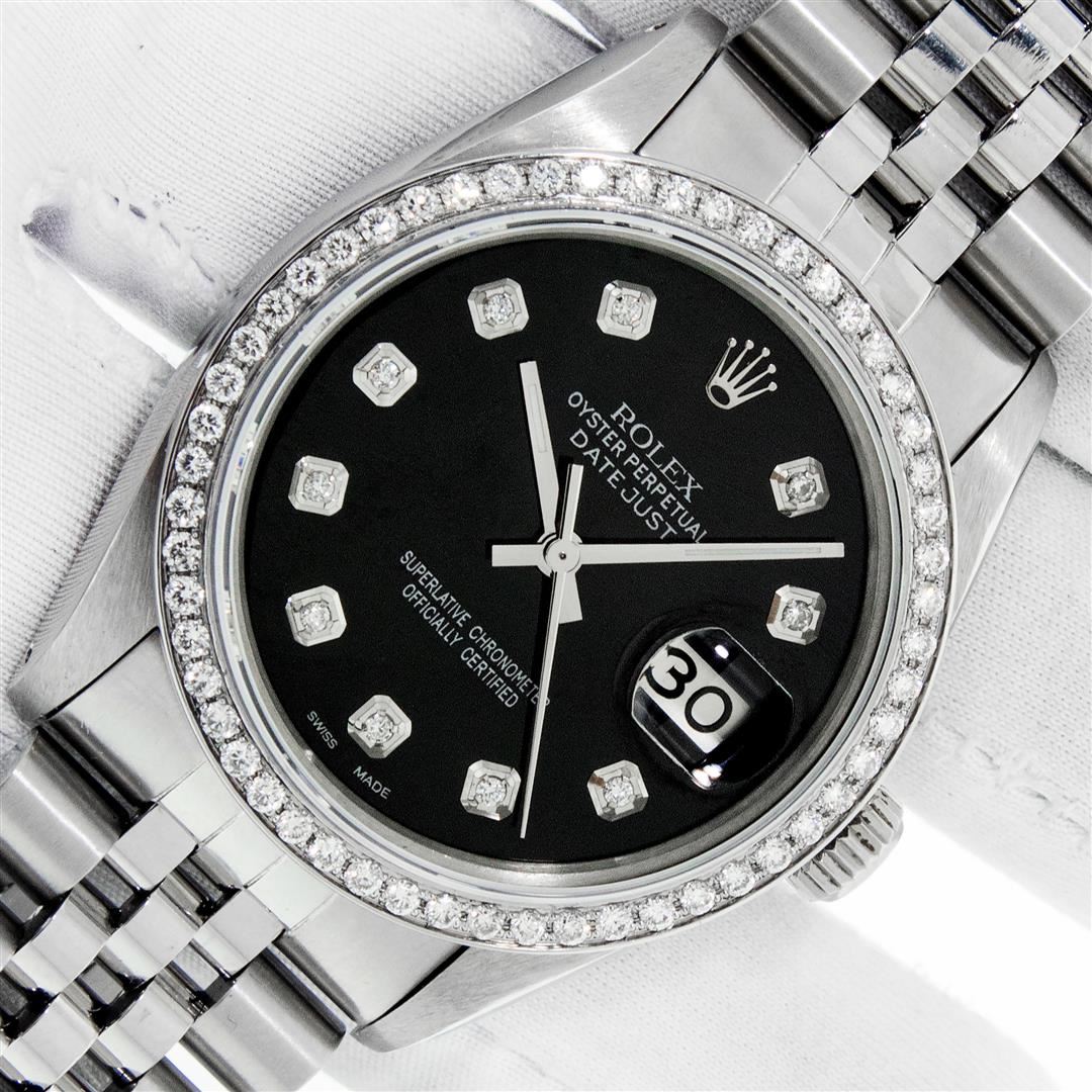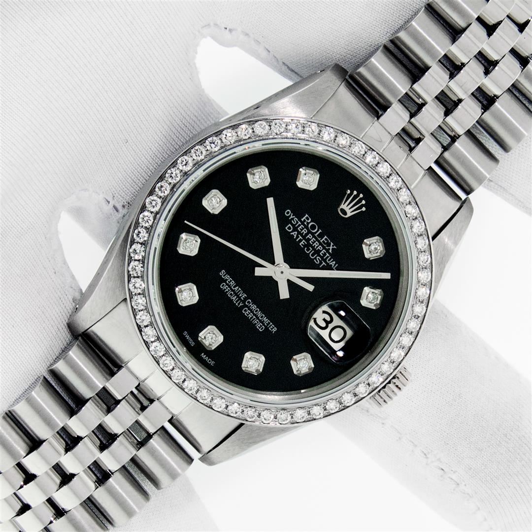 One Men's Rolex Stainless Steel Datejust Polished Bright with Satin Finish, This Watch Has Been Serviced & Electronically Tested, Rolex Stainless Steel Case: 36mm, Rolex Stainless Steel Crown, Custom Bezel: New Stainless Steel Beadset Diamond Bezel, Diamond Count: 54 Diamonds In Bezel, Total Weight 1.00 Carat, Clarity: SI-VS, Color: G to H. Custom Crystal: New Sapphire With Magnified Date Window. Custom Hands: New Luminescent Hands. Rolex Movement: Automatic Winding Movement. Custom Dial: Refinished To Black With Added Diamonds, Diamond Count: 10 Diamonds In Dial, Color: G to H, Clarity: VS2-SI1. Date Window: 3 O'clock Position Date Display, Quickset, Model: Datejust. Condition: G-6 Extra Fine. Rolex Bracelet: Stainless Steel Jubilee Band. Bright Polish & Satin Finish. 7.0 Inch Length, Adjustable. Standard Clasp, With Rolex Logo. This Pre Owned Watch Has Been Serviced Time Tested And Is In Excellent Condition It Is Free Of All Scratches And Dents. This Watch Comes With A Rolex Box.