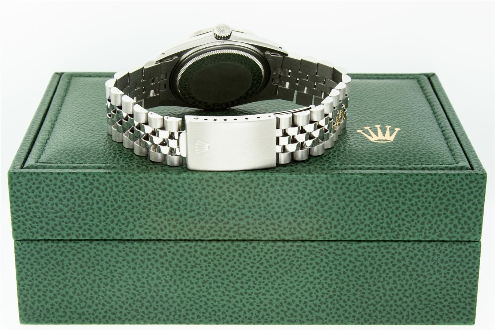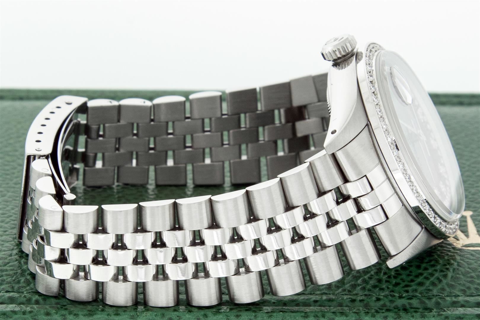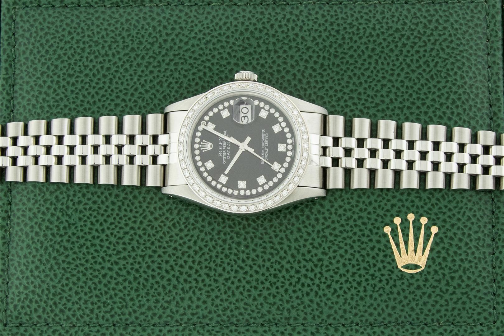One Mens Rolex Stainless Steel Datejust Polished Bright with Satin Finish, This Watch Has Been Serviced & Electronically Tested, Rolex Stainless Steel Case: 36mm, Rolex Stainless Steel Crown, Custom Bezel: New White Gold Beadset Bezel, Diamond Count: 44 Diamonds, Total Weight 1.00 Carat, Clarity: SI-VS, Color: G to H. Custom Crystal: New Sapphire With Cyclops Lens. Custom Hands: New Luminescent Hands. Rolex Movement: Automatic Winding Movement. Custom Dial: Refinished To Black String With Added Diamond Hour Markers, Diamond Count: 58 Diamonds In Dial, Color: G to H, Clarity: VS2-SI1. Date Window: 3 O'Clock Position Date Display, Quickset, Model: Datejust. Condition: G-6 Extra Fine. Rolex Bracelet: Stainless Steel Jubilee Band. Bright Polish & Satin Finish. 7.0 Inch Length, Adjustable. Standard Clasp, With Rolex Logo. This Pre Owned Watch Has Been Serviced Time Tested And Is In Excellent Condition It Is Free Of All Scratches And Dents.
