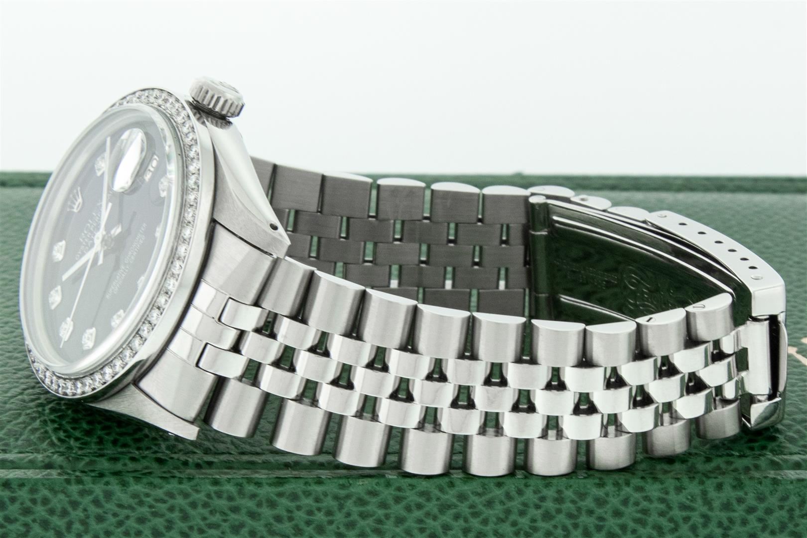 One Men's Rolex Stainless Steel Datejust Polished Bright with Satin Finish, This Watch Has Been Serviced & Electronically Tested, Rolex Stainless Steel Case: 36mm, Rolex Stainless Steel Crown, Custom Bezel: New Stainless Steel Beadset Diamond Bezel, Diamond Count: 54 Diamonds In Bezel, Total Weight 1.00 Carat, Clarity: SI-VS, Color: G to H. Custom Crystal: New Sapphire With Magnified Date Window. Custom Hands: New Luminescent Hands. Rolex Movement: Automatic Winding Movement. Custom Dial: Refinished To Black With Added Diamonds, Diamond Count: 10 Diamonds In Dial, Color: G to H, Clarity: VS2-SI1. Date Window: 3 O'clock Position Date Display, Quickset, Model: Datejust. Condition: G-6 Extra Fine. Rolex Bracelet: Stainless Steel Jubilee Band. Bright Polish & Satin Finish. 7.0 Inch Length, Adjustable. Standard Clasp, With Rolex Logo. This Pre Owned Watch Has Been Serviced Time Tested And Is In Excellent Condition It Is Free Of All Scratches And Dents. This Watch Comes With A Rolex Box.