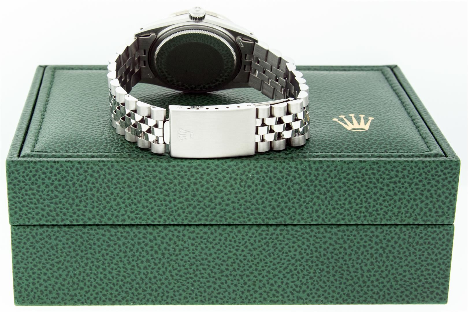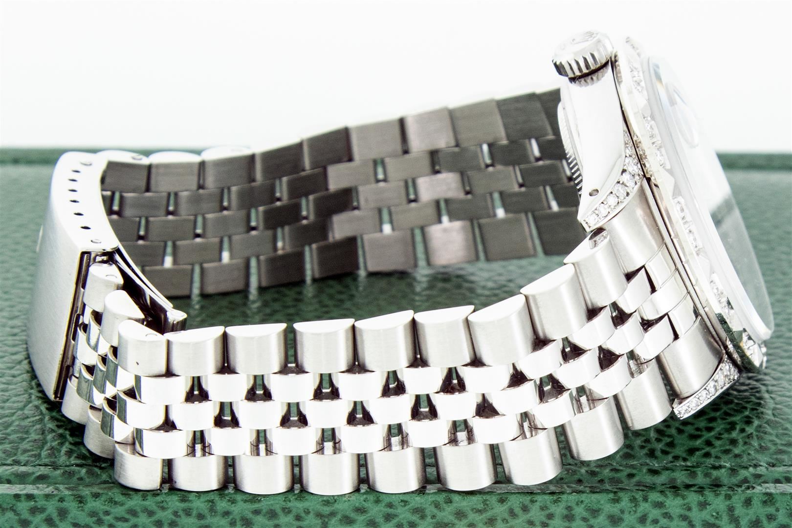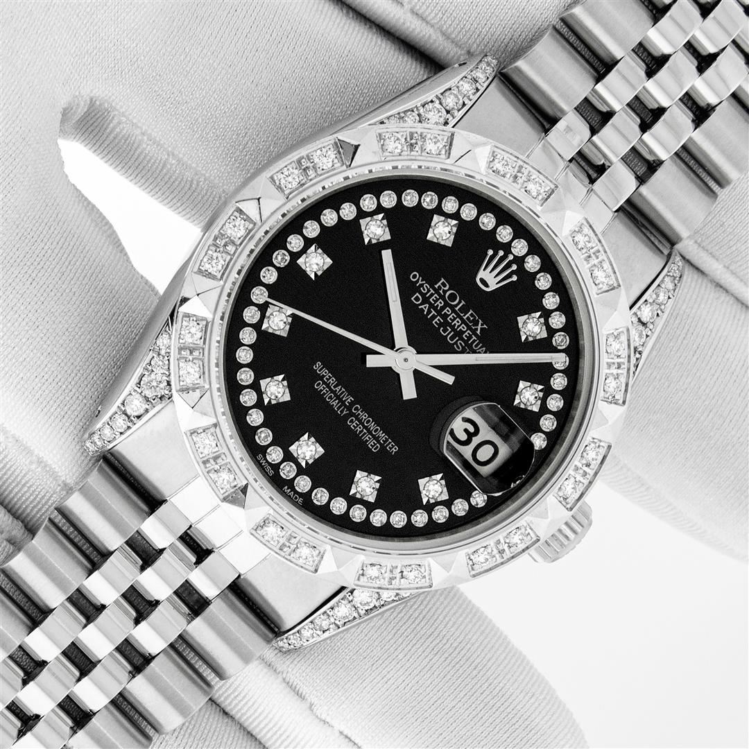 One Men's Stainless Steel Rolex Datejust Polished Bright with Satin Finish, Serviced & Electronically Tested, Rolex Stainless Steel Case: 36mm, Custom Diamonds On Lugs: 28 Diamonds On Lugs, Color: G to H, Clarity: SI-VS. Rolex Stainless Steel Crown, New Custom Bezel: 18K White Gold Pyramid Diamond Bezel, Diamond Count: 24 Diamonds On Bezel, Total Weight .75 Carat, Clarity: SI-VS, Color: G to H. Custom Crystal: New Scratch Resistant Synthetic Sapphire Cyclops Lens. Custom Hands: New Luminescent Hands. Rolex Movement: Automatic Winding Movement. Custom Dial: Refinished To Black With Custom Added Diamonds, Diamond Count: 58 Diamonds In Dial, Diamond Color: G To H In Color, Clarity: VS. Date Window: 3 O'clock Position Date Display, Quickset, Model: Datejust Condition: G-6 Extra Fine. Rolex Bracelet: Stainless Steel Jubilee Band. Bright Polish & Satin Finish. 7.0 Inch Length, Adjustable. Standard Clasp, With Rolex Logo. This Pre Owned Watch Has Been Serviced And Polished And Its Free Of All Dents And Scratches.