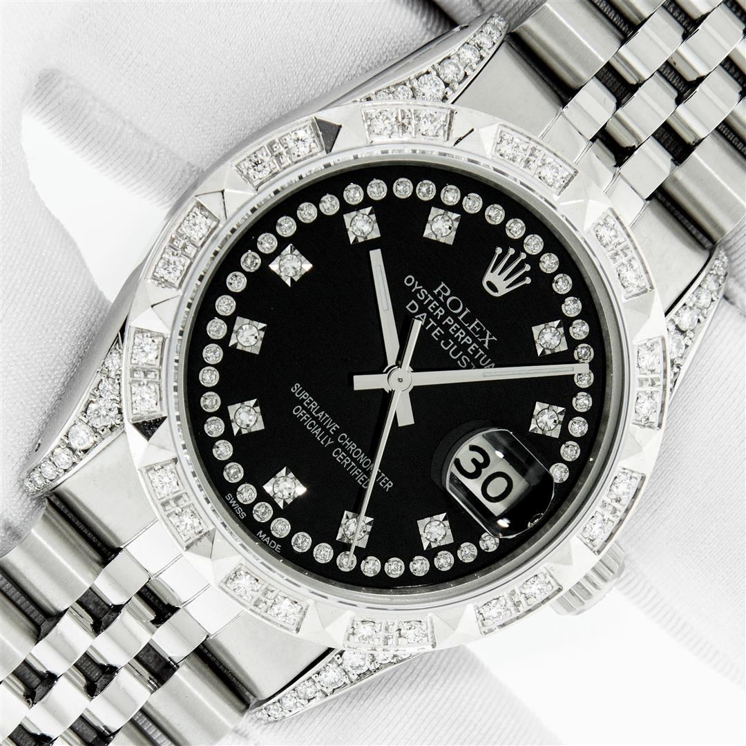 One Men's Stainless Steel Rolex Datejust Polished Bright with Satin Finish, Serviced & Electronically Tested, Rolex Stainless Steel Case: 36mm, Custom Diamonds On Lugs: 28 Diamonds On Lugs, Color: G to H, Clarity: SI-VS. Rolex Stainless Steel Crown, New Custom Bezel: 18K White Gold Pyramid Diamond Bezel, Diamond Count: 24 Diamonds On Bezel, Total Weight .75 Carat, Clarity: SI-VS, Color: G to H. Custom Crystal: New Scratch Resistant Synthetic Sapphire Cyclops Lens. Custom Hands: New Luminescent Hands. Rolex Movement: Automatic Winding Movement. Custom Dial: Refinished To Black With Custom Added Diamonds, Diamond Count: 58 Diamonds In Dial, Diamond Color: G To H In Color, Clarity: VS. Date Window: 3 O'clock Position Date Display, Quickset, Model: Datejust Condition: G-6 Extra Fine. Rolex Bracelet: Stainless Steel Jubilee Band. Bright Polish & Satin Finish. 7.0 Inch Length, Adjustable. Standard Clasp, With Rolex Logo. This Pre Owned Watch Has Been Serviced And Polished And Its Free Of All Dents And Scratches.