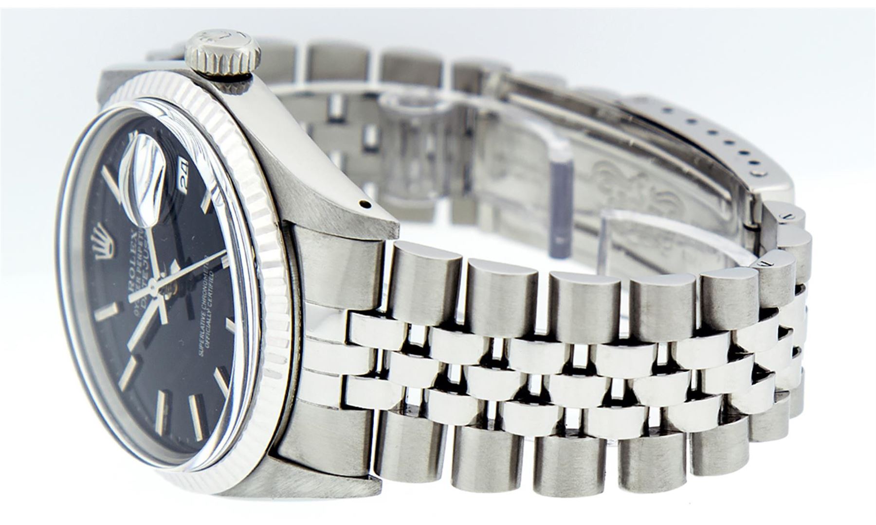 One Mens Rolex Datejust Polished, Serviced & Electronically Tested, Stainless Steel Case: 36mm, Stainless Steel Crown, Bezel: 14K White Gold Fluted Bezel. Custom Crystal: Acrylic Cyclops Lens. Custom Hands: New Luminescent Hands. Movement: Automatic Winding Movement Caliber 3035. Custom Dial: Black Dial With Index Hour Markers With Line Track. Date Window: 3 O'Clock Position Date Display, Quickset, Model: Datejust, Condition: G-6 Extra Fine. Bracelet: Stainless Steel Jubilee. Bright Polish & Satin Finish. 7.0 Inch Length, Adjustable. Standard Clasp, With Rolex Logo. Watch Has Been Serviced And Polished It Is Free Of All Scratches And Dents.