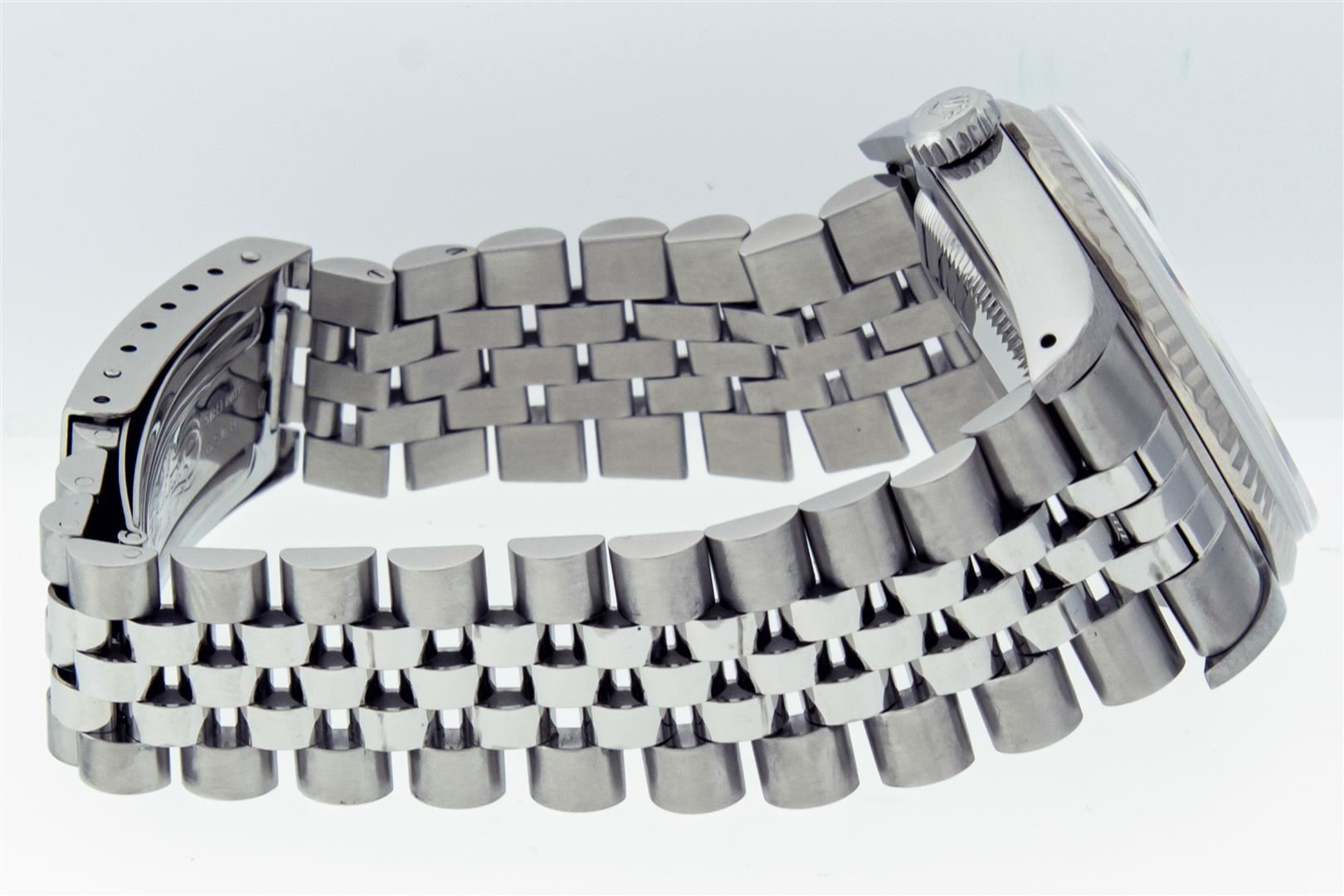 One Men's Pre Owned Stainless Steel Rolex Datejust Polished, Serviced & Electronically Tested, Rolex Stainless Steel Case: 36mm, Rolex Stainless Steel Crown, Rolex Bezel: 14K White Gold Fluted Bezel. Custom Crystal: New Acrylic With Magnified Date Window. Custom Hands: Luminescent Hands. Rolex Movement: Automatic Winding Movement. Custom Dial: Refinished To Black Index With Square Roman Track. Date Window: 3 O'clock Position Date Display, Quickset, Model: Datejust, Condition: G-6 Extra Fine. Rolex Bracelet: Stainless Steel Jubilee Band. Bright Polish & Satin Finish. 7.0 Inch Length, Adjustable. Standard Clasp, With Rolex Logo. This Pre Owned Watch Has Been Serviced Time Tested And Is In Excellent Condition It Is Free Of All Scratches And Dents.