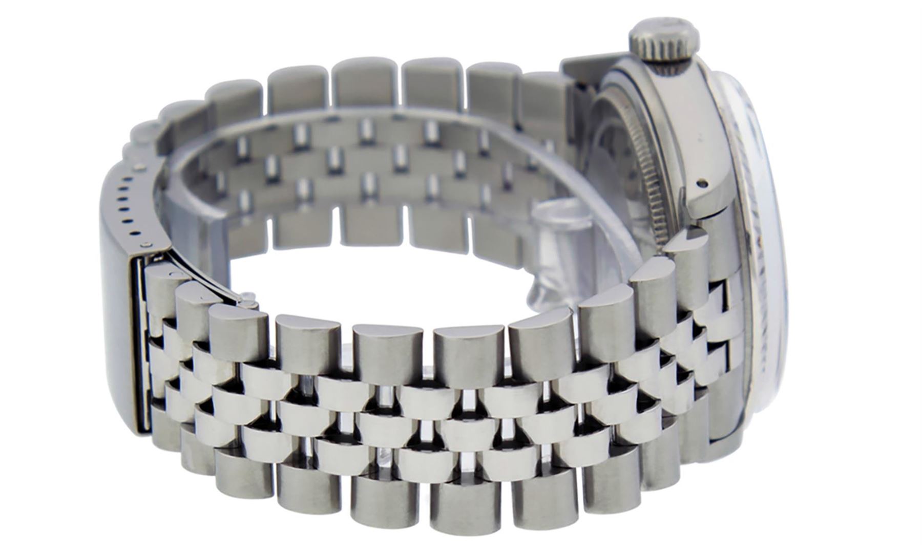 One Men's Stainless Steel Rolex Datejust Polished Bright with Satin Finish, Serviced & Electronically Tested, Stainless Steel Case: 36mm, Stainless Steel Crown, Bezel: 14K White Gold Fluted Bezel. Custom Crystal: New Acrylic Cyclops Lens. Custom Hands: New Hands. Movement: Automatic Winding Movement Caliber 3035. Custom Dial: Black Roman. Date Window: 3 O'clock Position Date Display, Quickset, Model: Datejust, Condition: G-6 Extra Fine. Bracelet: Stainless Steel Jubilee. Bright Polish & Satin Finish. 7.0 Inch Length, Adjustable. Standard Clasp, With Rolex Logo. Watch Has Been Serviced And Polished It Is Free Of All Scratches And Dents.