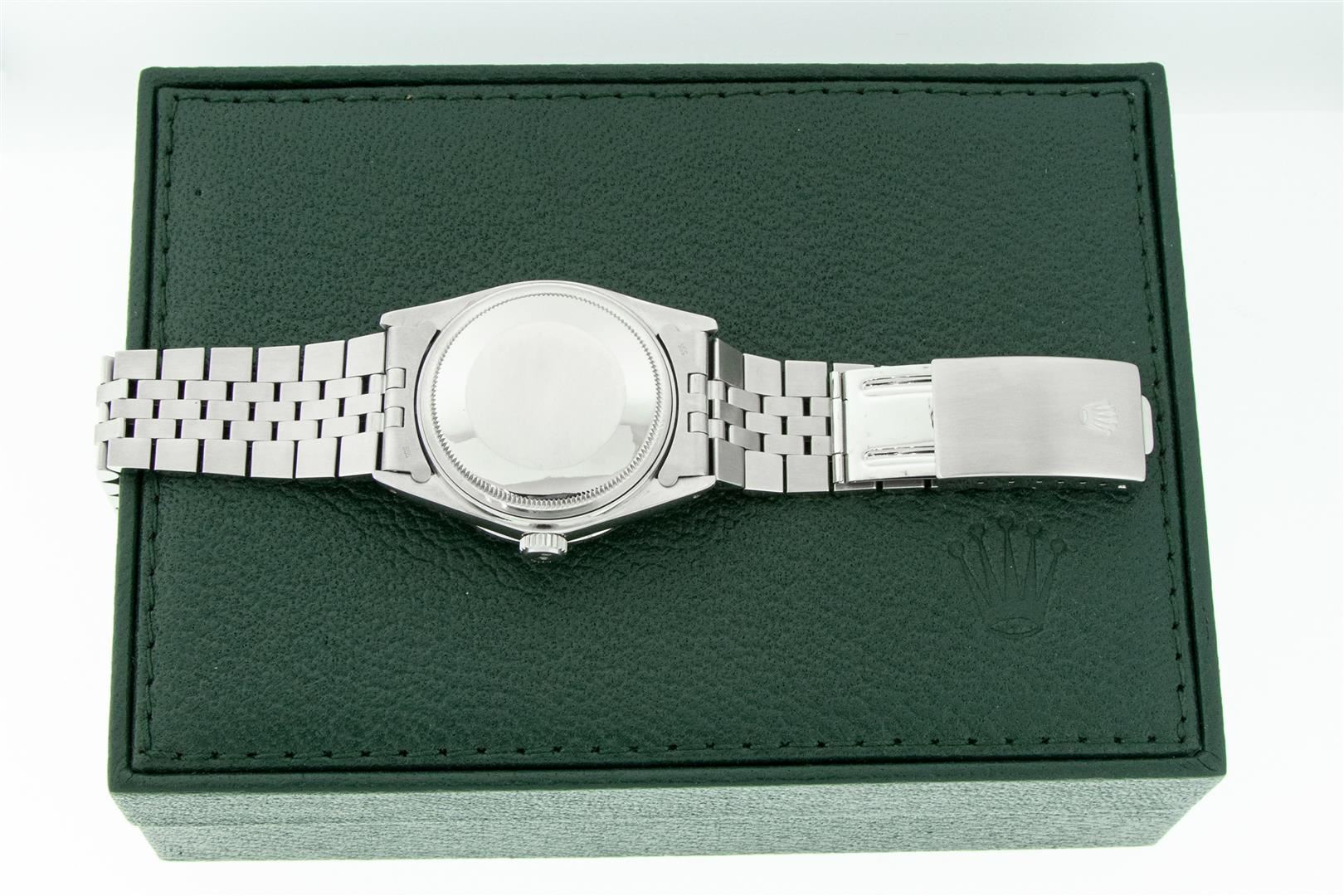 One Men's Stainless Steel Rolex Quickset Datejust Polished Bright with Satin Finish, Serviced & Electronically Tested, Rolex Stainless Steel Case: 36mm, Custom Diamond Lugs: 24 Diamonds On Lugs, Color: G to H, Clarity: SI-VS. Rolex Stainless Steel Crown, New Custom Bezel: 18K White Gold Beadset + Sapphire Diamond Bezel, Diamond Count: 36 Diamonds + 4 Sapphires On Bezel, Total Bezel Weight 1.00 Carat, Clarity: SI-VS, Color: G to H. Custom Crystal: New Sapphire With Magnified Date Window. Rolex Movement: Automatic Winding Movement. Custom Dial: Refinished To Black With Added Diamond Roman Hour Markers, Diamond Color: G To H In Color, Clarity: SI-VS. Date Window: 3 O'clock Position Date Display, Quickset, Model: Quickset Datejust, Condition: G-6 Extra Fine. Rolex Bracelet: Stainless Steel Jubilee Band. Bright Polish & Satin Finish. 7.0 Inch Length, Adjustable. Standard Clasp, With Rolex Logo. This Pre Owned Watch Has Been Serviced Time Tested And Is In Excellent Condition It Is Free Of All Scratches And Dents. This Watch Comes With A Rolex Box.