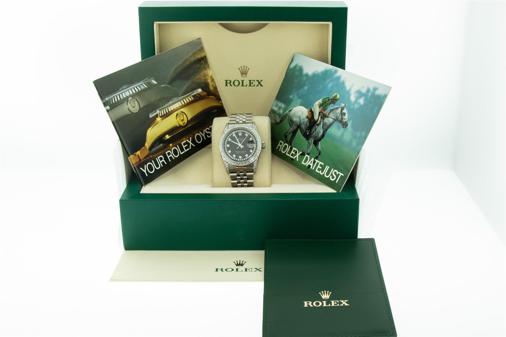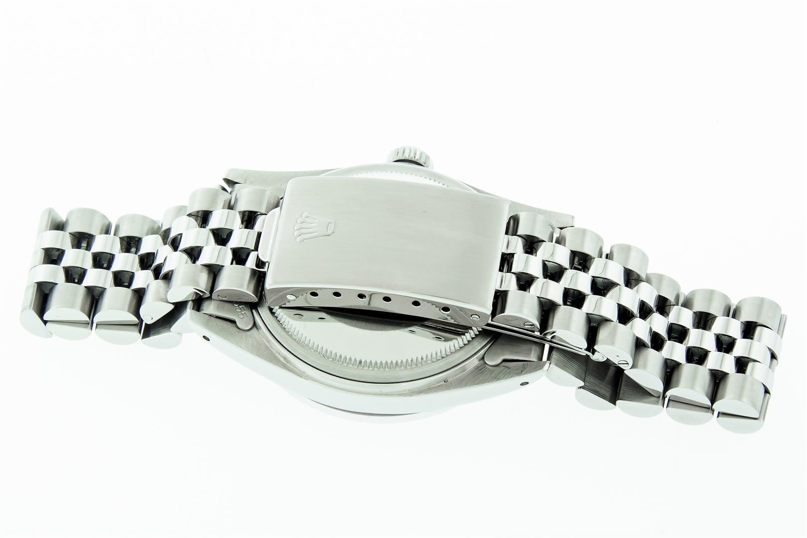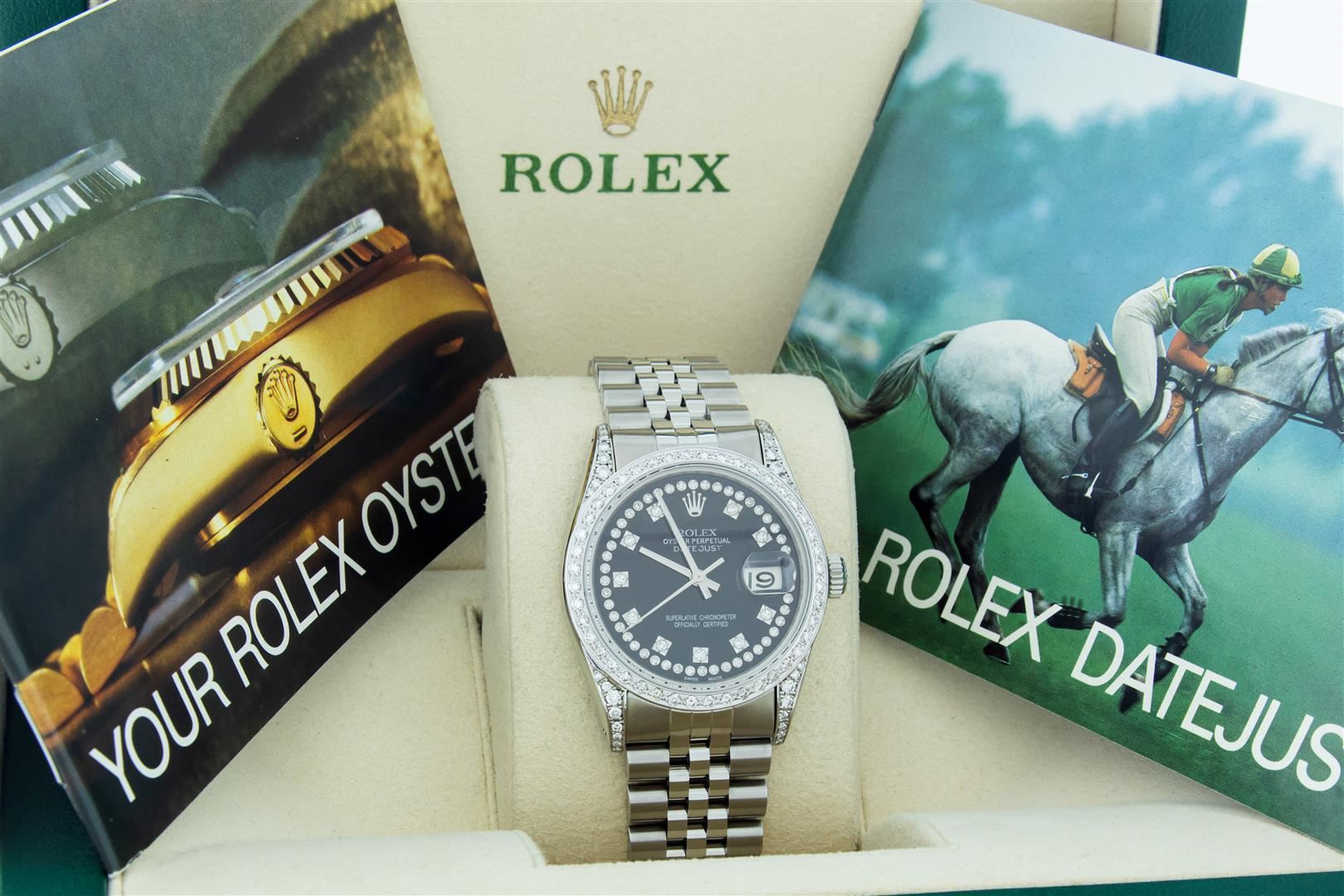 One Men's Rolex Datejust Polished Bright with Satin Finish, Serviced & Electronically Tested, Rolex Stainless Steel Case: 36mm, Custom Diamond Lugs: 28 Diamonds On Lugs, Color: G to H, Clarity: SI-VS. Rolex Stainless Steel Crown, Custom Bezel: 18K White Gold Diamond Beadset Bezel, Diamond Count: 44 Diamonds, Total Weight 1.00 Carat, Clarity: SI-VS, Color: G to H. Custom Crystal: New Sapphire With Magnified Date Window. Custom Hands: New Luminescent Hands. Rolex Movement: Automatic Winding Movement. Custom Dial: Black String Diamond Dial, Stone Count: 43 Diamonds On Dial, Diamond Color: G To H In Color, Clarity: VS. Date Window: 3 O'clock Position Date Display, Quickset, Model: Datejust Condition: G-6 Extra Fine. Rolex Bracelet: Stainless Steel Jubilee Band. Bright Polish & Satin Finish. 7.0 Inch Length, Adjustable. Standard Clasp, With Rolex Logo. This Pre Owned Watch Has Been Serviced And Polished And Its Free Of All Dents And Scratches. This Watch Comes With A Rolex Box And Booklets.