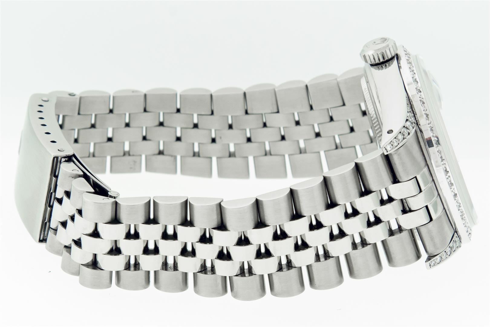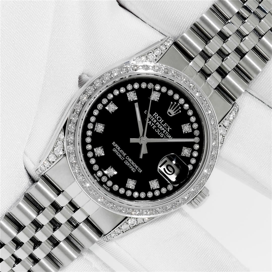 One Men's Rolex Datejust Polished Bright with Satin Finish, Serviced & Electronically Tested, Rolex Stainless Steel Case: 36mm, Custom Diamond Lugs: 28 Diamonds On Lugs, Color: G to H, Clarity: SI-VS. Rolex Stainless Steel Crown, Custom Bezel: 18K White Gold Diamond Beadset Bezel, Diamond Count: 44 Diamonds, Total Weight 1.00 Carat, Clarity: SI-VS, Color: G to H. Custom Crystal: New Sapphire With Magnified Date Window. Custom Hands: New Luminescent Hands. Rolex Movement: Automatic Winding Movement. Custom Dial: Black String Diamond Dial, Stone Count: 43 Diamonds On Dial, Diamond Color: G To H In Color, Clarity: VS. Date Window: 3 O'clock Position Date Display, Quickset, Model: Datejust Condition: G-6 Extra Fine. Rolex Bracelet: Stainless Steel Jubilee Band. Bright Polish & Satin Finish. 7.0 Inch Length, Adjustable. Standard Clasp, With Rolex Logo. This Pre Owned Watch Has Been Serviced And Polished And Its Free Of All Dents And Scratches. This Watch Comes With A Rolex Box And Booklets.