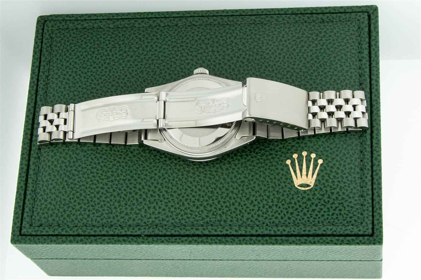 One Men's Rolex Datejust Polished Bright with Satin Finish, Serviced & Electronically Tested, Rolex Stainless Steel Case: 36mm, Custom Diamond Lugs: 28 Diamonds In Lugs, Color: G to H, Clarity: SI-VS. Rolex Stainless Steel Crown, Custom Bezel: 18K White Gold Diamond + Ruby Beadset, Diamond Count: 36 Diamonds + 4 Rubies, Total Weight 1.00 Carat, Clarity: SI-VS, Color: G to H. Custom Crystal: New Sapphire With Magnified Date Window. Custom Hands: New Luminescent Hands. Rolex Movement: Automatic Winding Movement. Custom Dial: Refinished To Black String With Added Diamonds, Stone Count: 58 Diamonds In Dial, Diamond Color: G To H In Color, Clarity: VS. Date Window: 3 O'clock Position Date Display, Quickset, Model: Datejust Condition: G-6 Extra Fine. Rolex Bracelet: Stainless Steel Jubilee Band. Bright Polish & Satin Finish. 7.0 Inch Length, Adjustable. Standard Clasp, With Rolex Logo. This Pre Owned Watch Has Been Serviced And Polished And Its Free Of All Dents And Scratches. This Watch Comes With A Rolex Box.