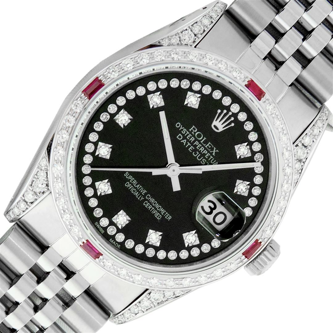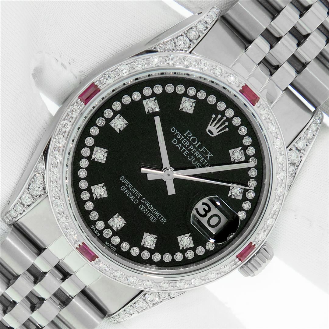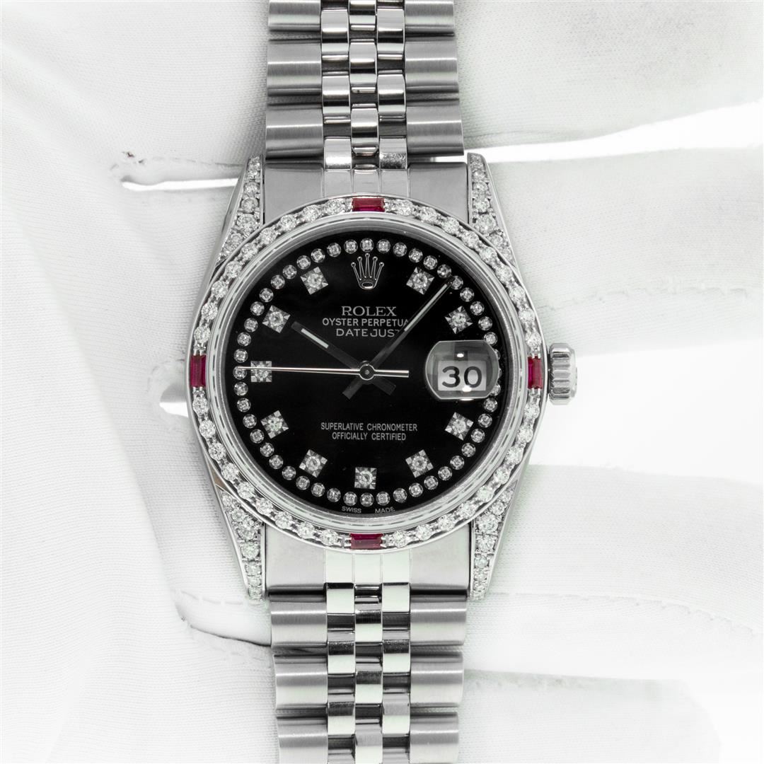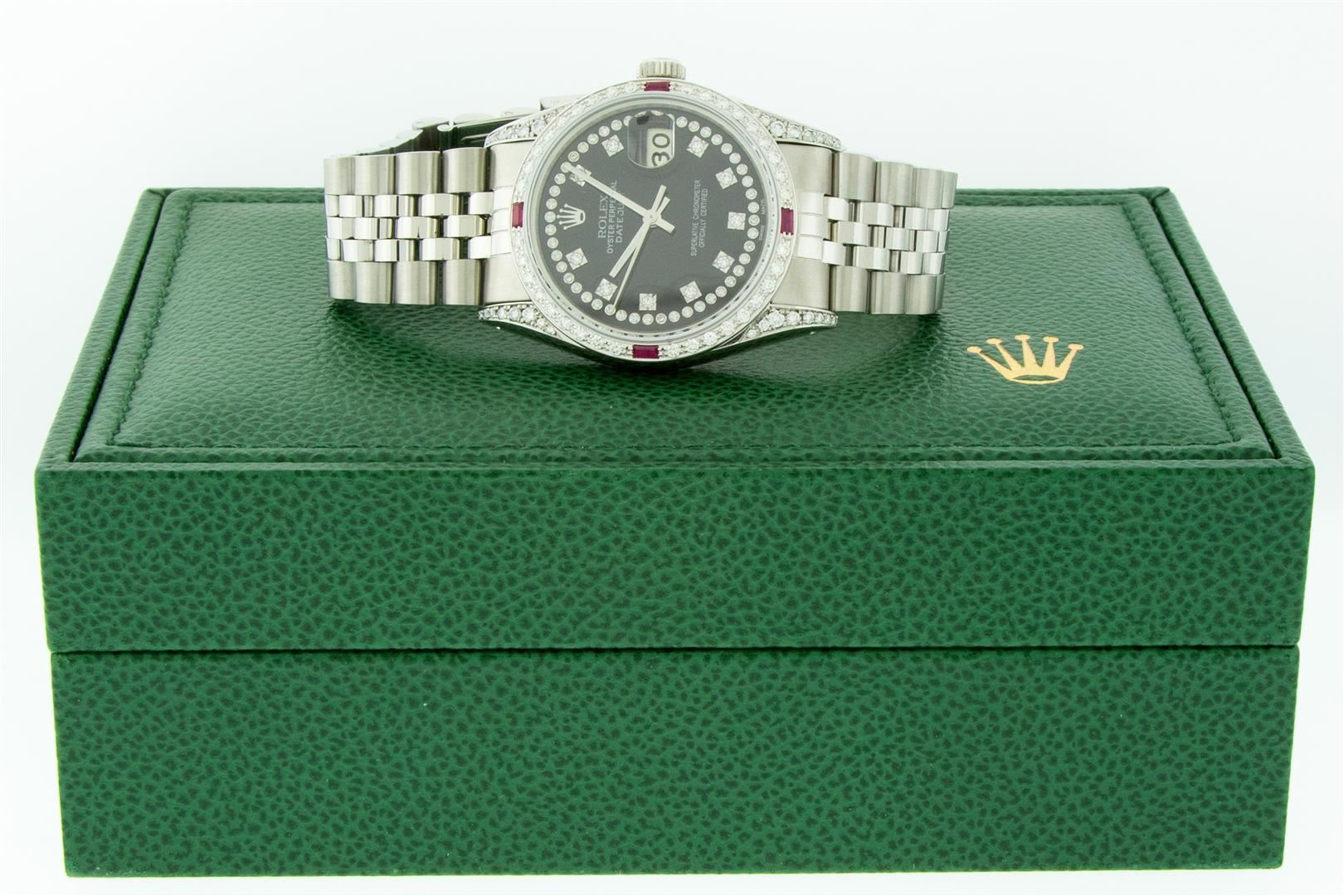 One Men's Rolex Datejust Polished Bright with Satin Finish, Serviced & Electronically Tested, Rolex Stainless Steel Case: 36mm, Custom Diamond Lugs: 28 Diamonds In Lugs, Color: G to H, Clarity: SI-VS. Rolex Stainless Steel Crown, Custom Bezel: 18K White Gold Diamond + Ruby Beadset, Diamond Count: 36 Diamonds + 4 Rubies, Total Weight 1.00 Carat, Clarity: SI-VS, Color: G to H. Custom Crystal: New Sapphire With Magnified Date Window. Custom Hands: New Luminescent Hands. Rolex Movement: Automatic Winding Movement. Custom Dial: Refinished To Black String With Added Diamonds, Stone Count: 58 Diamonds In Dial, Diamond Color: G To H In Color, Clarity: VS. Date Window: 3 O'clock Position Date Display, Quickset, Model: Datejust Condition: G-6 Extra Fine. Rolex Bracelet: Stainless Steel Jubilee Band. Bright Polish & Satin Finish. 7.0 Inch Length, Adjustable. Standard Clasp, With Rolex Logo. This Pre Owned Watch Has Been Serviced And Polished And Its Free Of All Dents And Scratches. This Watch Comes With A Rolex Box.