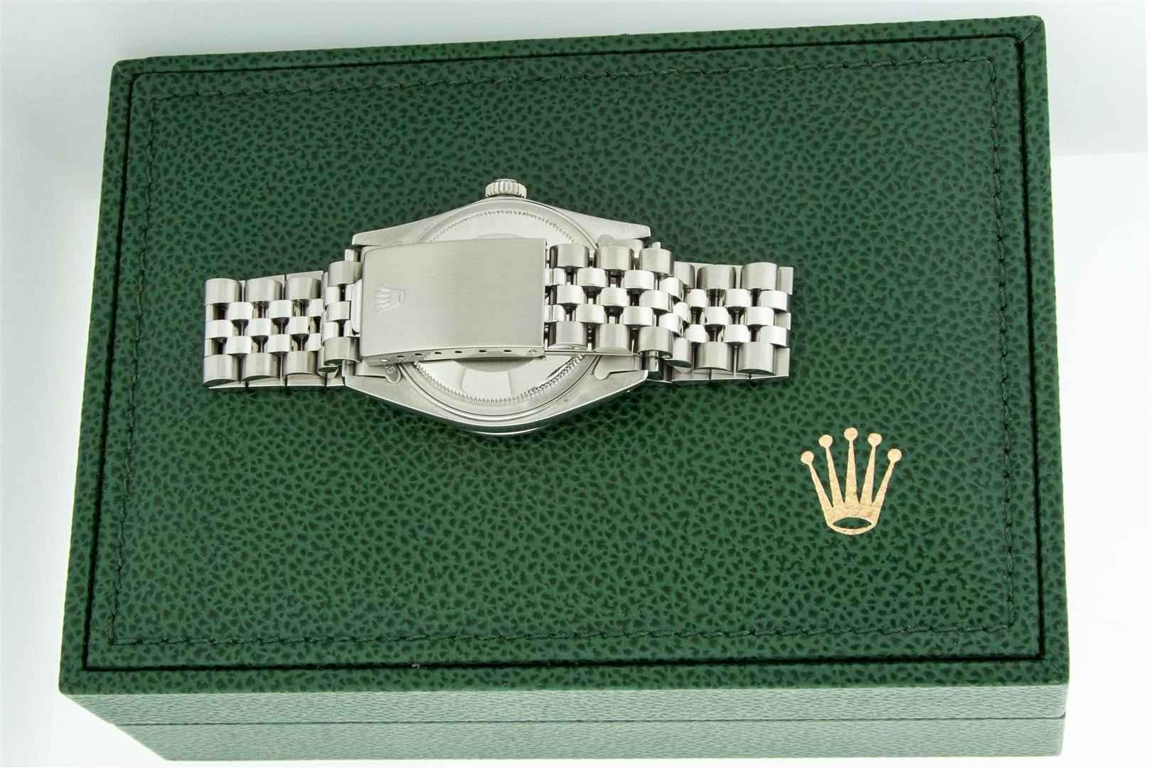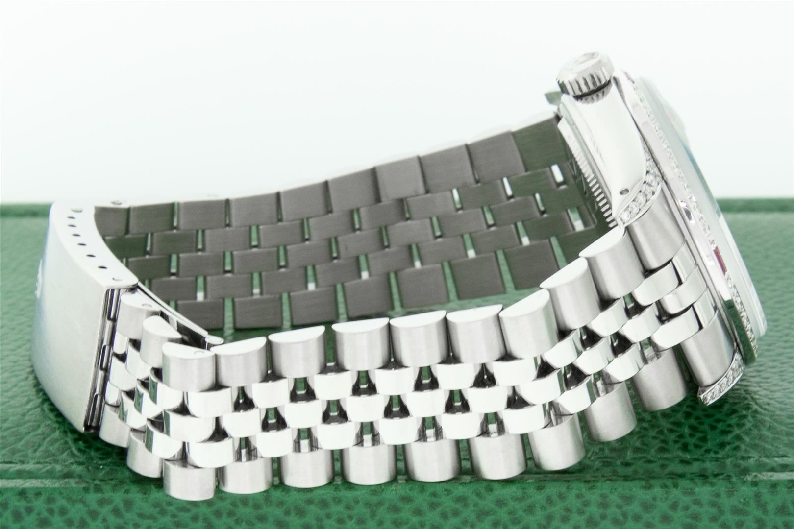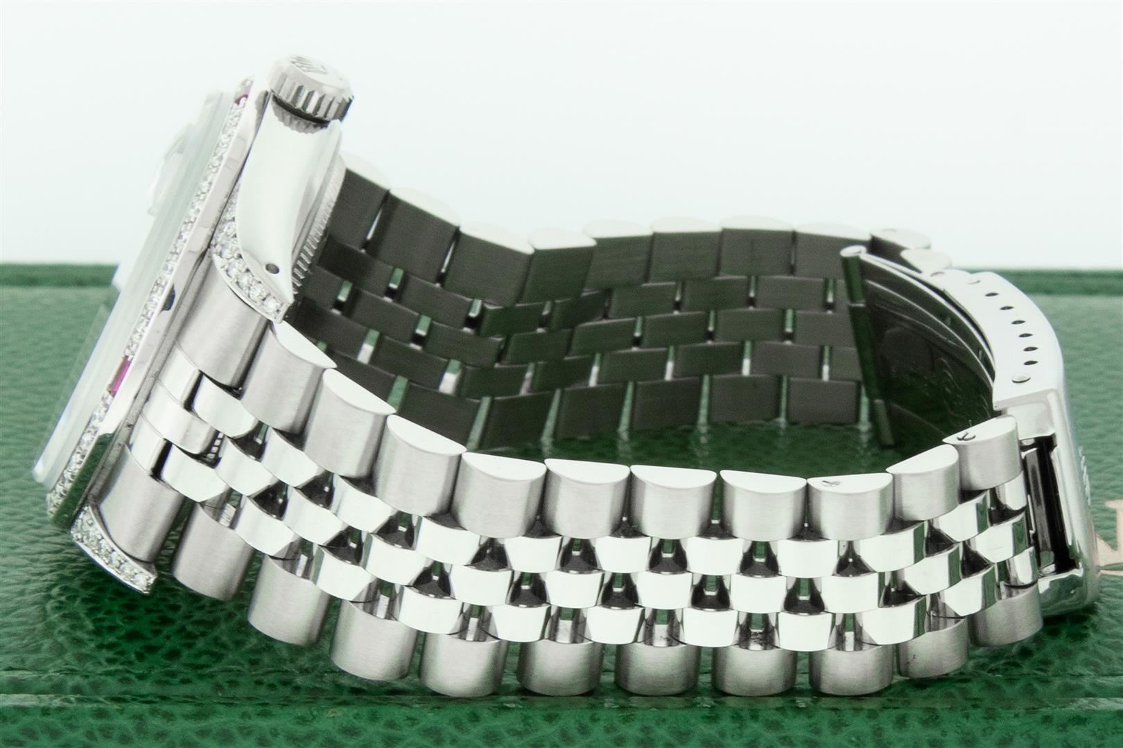 One Men's Rolex Datejust Polished Bright with Satin Finish, Serviced & Electronically Tested, Rolex Stainless Steel Case: 36mm, Custom Diamond Lugs: 28 Diamonds In Lugs, Color: G to H, Clarity: SI-VS. Rolex Stainless Steel Crown, Custom Bezel: 18K White Gold Diamond + Ruby Beadset, Diamond Count: 36 Diamonds + 4 Rubies, Total Weight 1.00 Carat, Clarity: SI-VS, Color: G to H. Custom Crystal: New Sapphire With Magnified Date Window. Custom Hands: New Luminescent Hands. Rolex Movement: Automatic Winding Movement. Custom Dial: Refinished To Black String With Added Diamonds, Stone Count: 58 Diamonds In Dial, Diamond Color: G To H In Color, Clarity: VS. Date Window: 3 O'clock Position Date Display, Quickset, Model: Datejust Condition: G-6 Extra Fine. Rolex Bracelet: Stainless Steel Jubilee Band. Bright Polish & Satin Finish. 7.0 Inch Length, Adjustable. Standard Clasp, With Rolex Logo. This Pre Owned Watch Has Been Serviced And Polished And Its Free Of All Dents And Scratches. This Watch Comes With A Rolex Box.