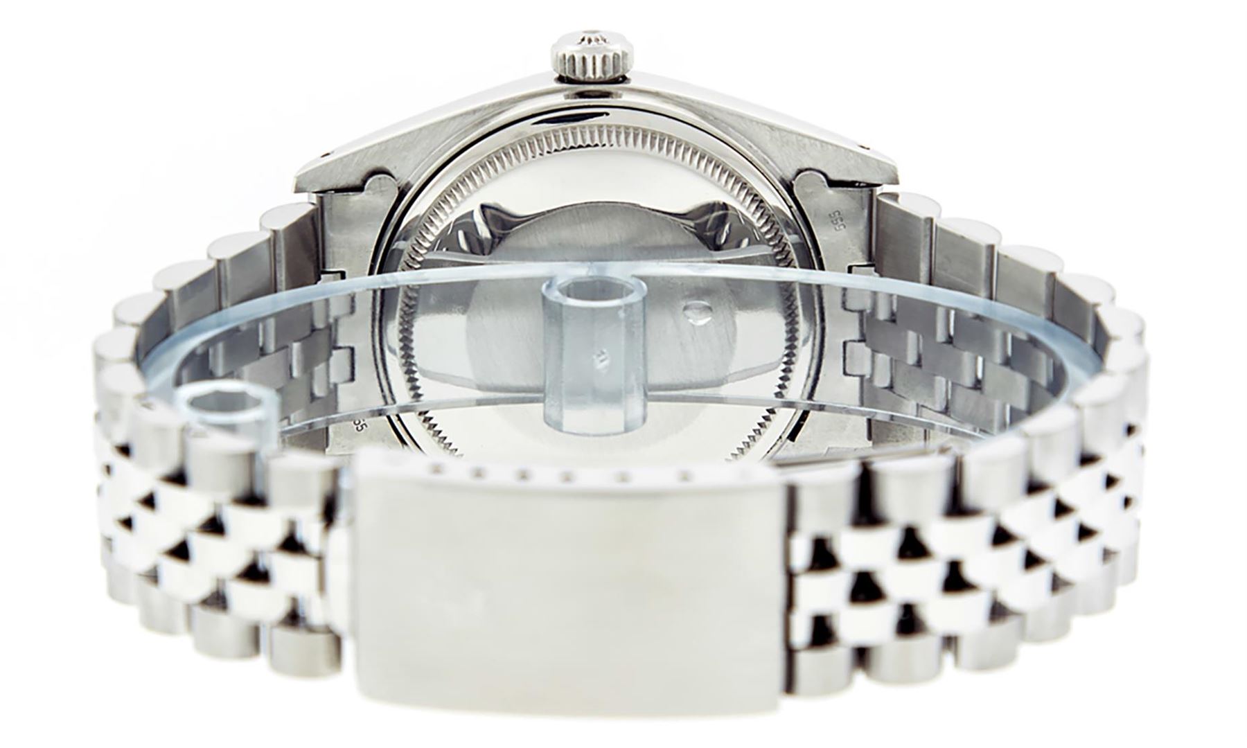 One Men's Pre Owned Stainless Steel Rolex Datejust Polished Bright with Satin Finish, Serviced & Electronically Tested, Rolex Stainless Steel Case: 36mm, Rolex Stainless Steel Crown, Rolex Bezel: White Gold Fluted Bezel. Custom Crystal: New Acrylic Cyclops Lens. Custom Hands: New Luminescent Hands. Rolex Movement: Automatic Winding Movement. Custom Dial: Custom Blue Diamond Dial With Added Diamond Hour Markers, Diamond Count: 10 Diamond in Dial G To H In Color, SI-VS Clarity. Date Window: 3 O'Clock Position Date Display, Quickset, Model: Datejust, Condition: G-6 Extra Fine. Rolex Bracelet: Stainless Steel Jubilee Band. Bright Polish & Satin Finish. 7.0 Inch Length, Adjustable. Standard Clasp, With Rolex Logo. This Watch Has Been Serviced Time Tested And Is In Excellent Condition It Is Free Of All Scratches And Dents.