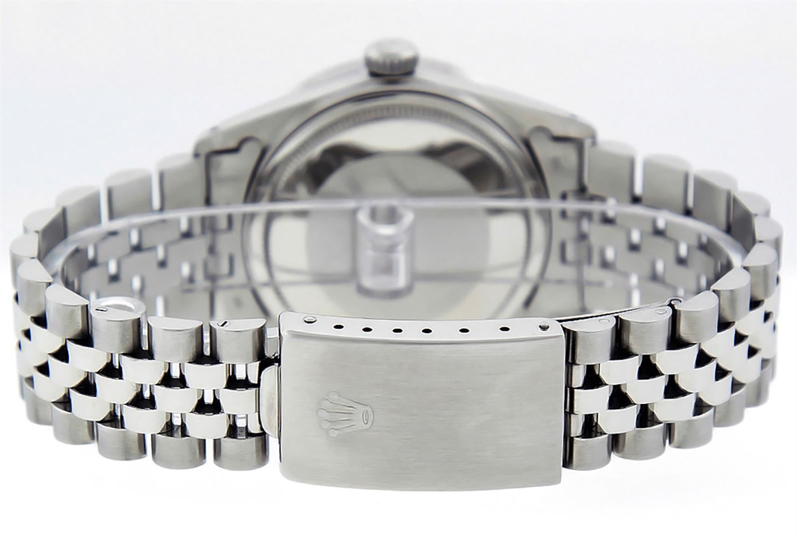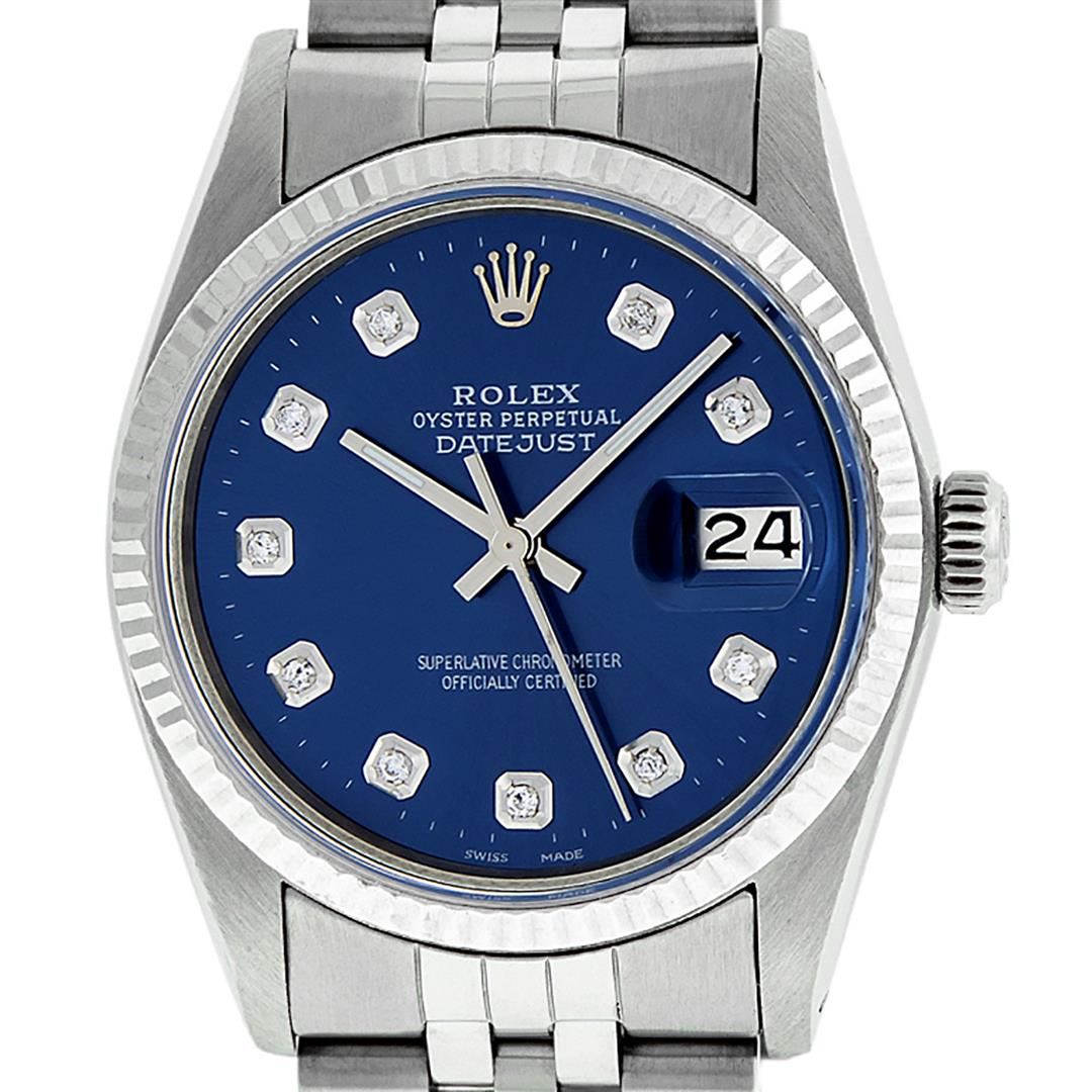 One Men's Pre Owned Stainless Steel Rolex Datejust Polished Bright with Satin Finish, Serviced & Electronically Tested, Rolex Stainless Steel Case: 36mm, Rolex Stainless Steel Crown, Rolex Bezel: White Gold Fluted Bezel. Custom Crystal: New Acrylic Cyclops Lens. Custom Hands: New Luminescent Hands. Rolex Movement: Automatic Winding Movement. Custom Dial: Custom Blue Diamond Dial With Added Diamond Hour Markers, Diamond Count: 10 Diamond in Dial G To H In Color, SI-VS Clarity. Date Window: 3 O'Clock Position Date Display, Quickset, Model: Datejust, Condition: G-6 Extra Fine. Rolex Bracelet: Stainless Steel Jubilee Band. Bright Polish & Satin Finish. 7.0 Inch Length, Adjustable. Standard Clasp, With Rolex Logo. This Watch Has Been Serviced Time Tested And Is In Excellent Condition It Is Free Of All Scratches And Dents.