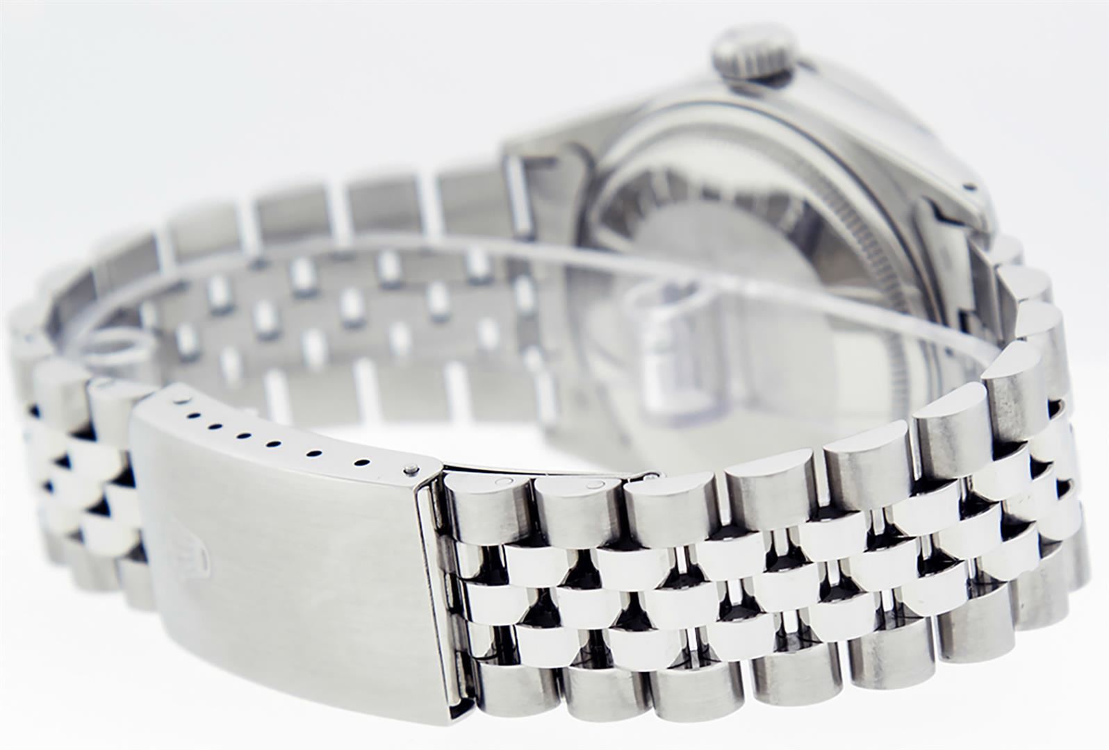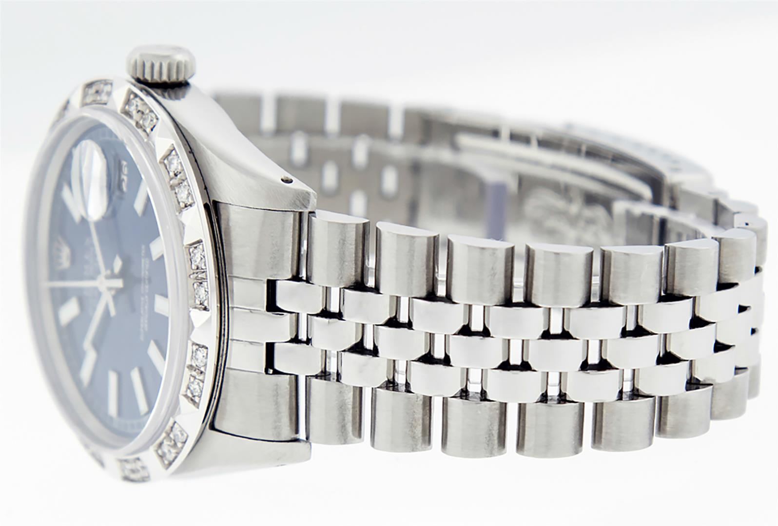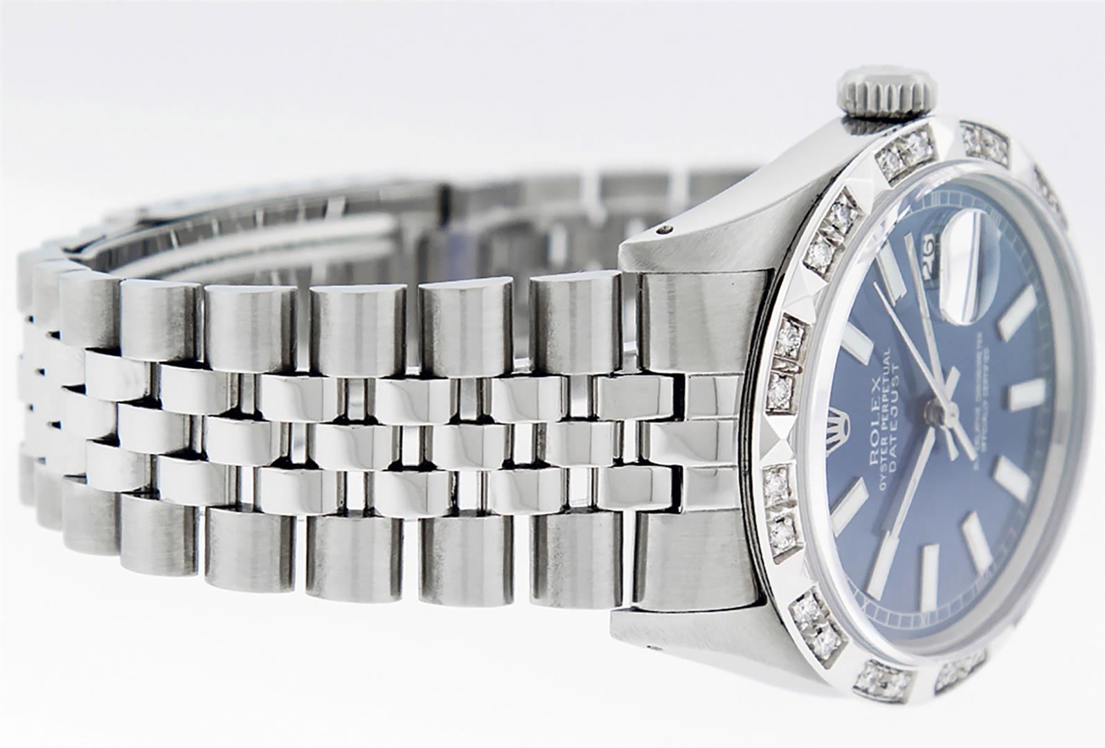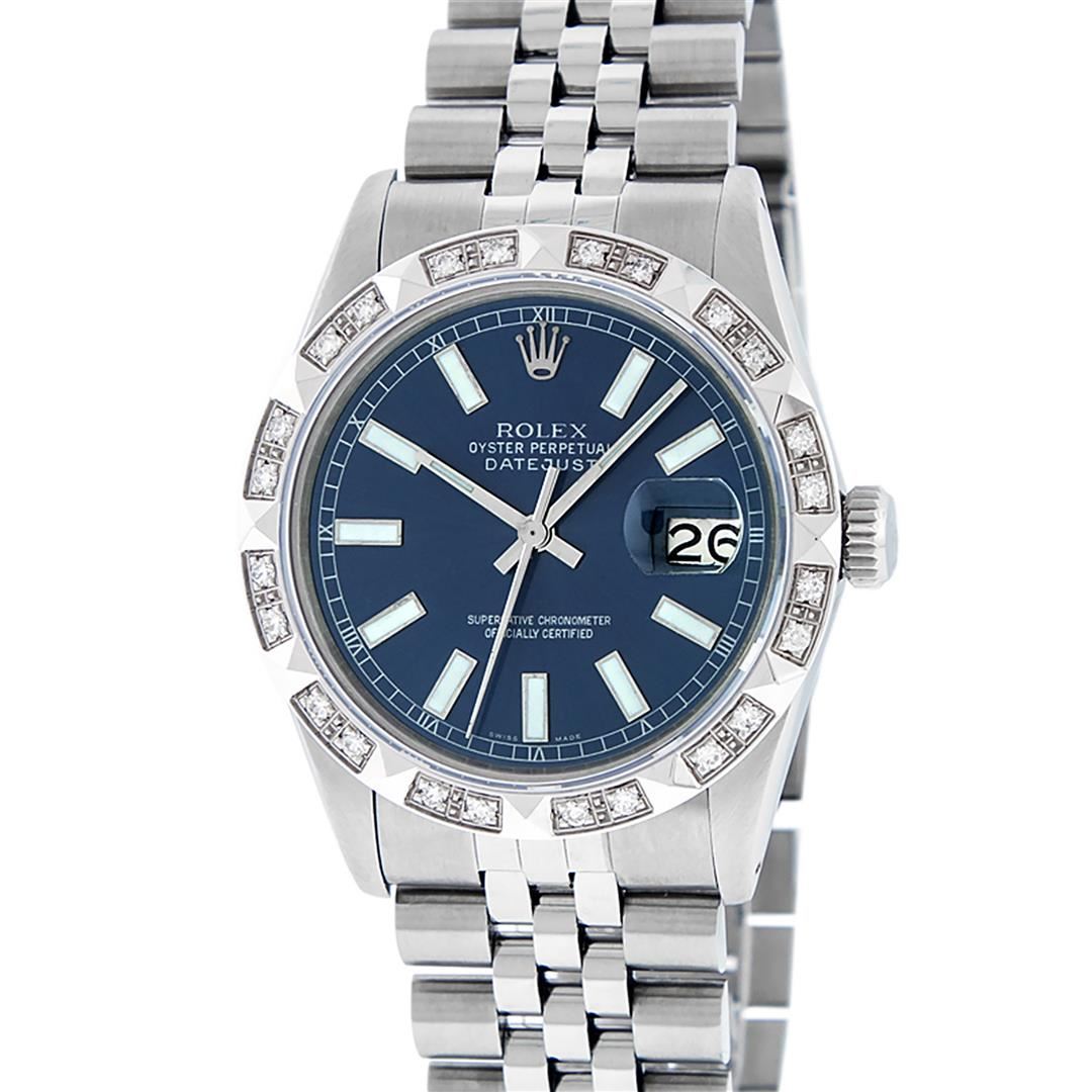 One Men's Pre Owned Stainless Steel Rolex Datejust Polished Bright with Satin Finish, Serviced & Electronically Tested, Rolex Stainless Steel Case: 36mm, Rolex Stainless Steel Crown, Custom Bezel: New 18K White Gold Pyramid Diamond Bezel, Diamond Count: 24 Diamonds, Total Weight .70 Carat, Clarity: SI-VS, Color: G to H. Custom Crystal: New Sapphire With Cyclops Lens. Custom Hands: New Luminescent Hands. Rolex Movement: Automatic Winding Movement. Rolex Dial: Factory Rolex Blue Index Dial. Date Window: 3 O'Clock Position Date Display, Quickset, Model: Datejust. Condition: G-6 Extra Fine. Rolex Bracelet: Stainless Steel Jubilee Band. Bright Polish & Satin Finish. 7.0 Inch Length, Adjustable. Standard Clasp, With Rolex Logo. This Watch Has Been Serviced Time Tested And Is In Excellent Condition It Is Free Of All Scratches And Dents.