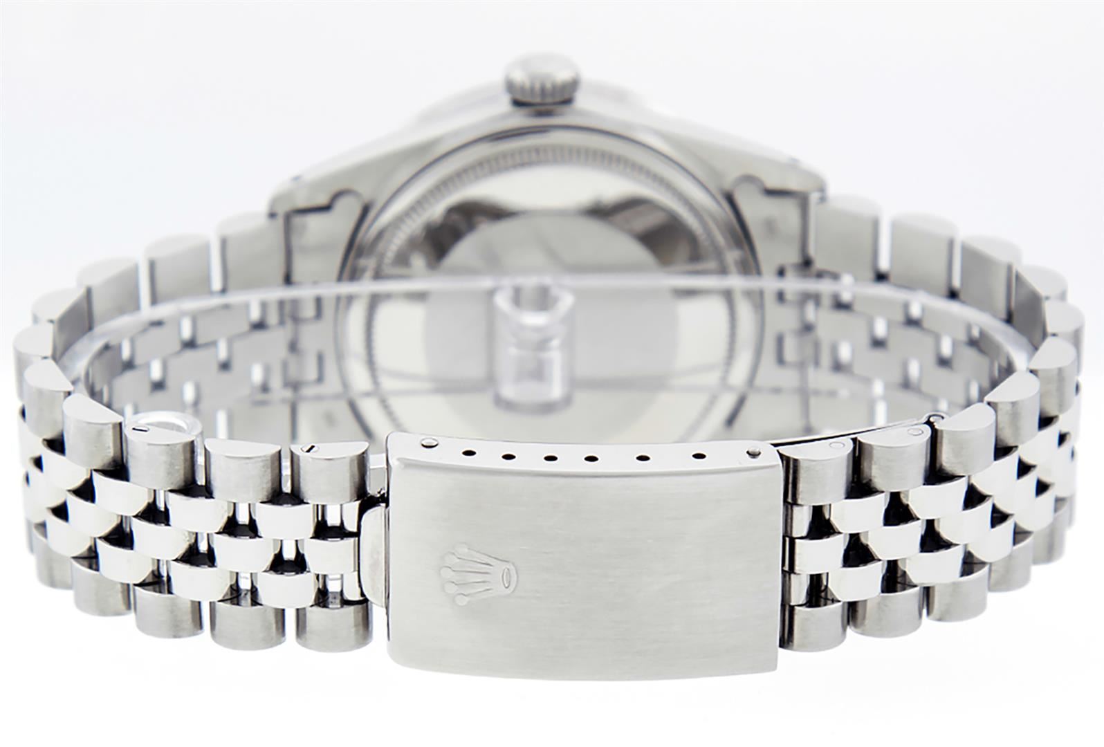 One Men's Pre Owned Stainless Steel Rolex Datejust Polished Bright with Satin Finish, Serviced & Electronically Tested, Rolex Stainless Steel Case: 36mm, Rolex Stainless Steel Crown, Custom Bezel: New 18K White Gold Pyramid Diamond Bezel, Diamond Count: 24 Diamonds, Total Weight .70 Carat, Clarity: SI-VS, Color: G to H. Custom Crystal: New Sapphire With Cyclops Lens. Custom Hands: New Luminescent Hands. Rolex Movement: Automatic Winding Movement. Rolex Dial: Factory Rolex Blue Index Dial. Date Window: 3 O'Clock Position Date Display, Quickset, Model: Datejust. Condition: G-6 Extra Fine. Rolex Bracelet: Stainless Steel Jubilee Band. Bright Polish & Satin Finish. 7.0 Inch Length, Adjustable. Standard Clasp, With Rolex Logo. This Watch Has Been Serviced Time Tested And Is In Excellent Condition It Is Free Of All Scratches And Dents.