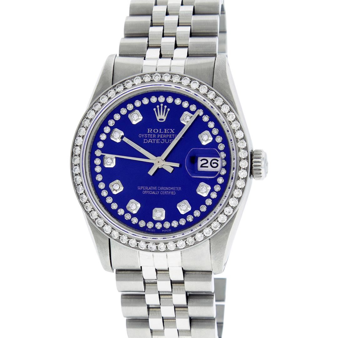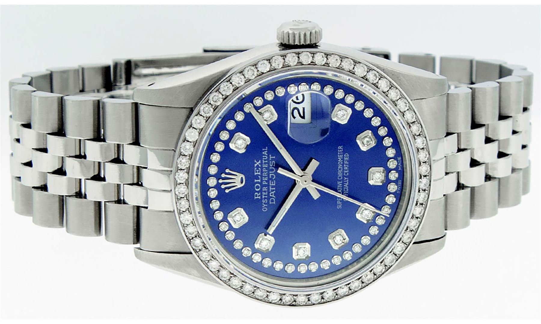 One Men's Rolex Stainless Steel Datejust Polished Bright with Satin Finish, This Watch Has Been Serviced & Electronically Tested, Stainless Steel Case: 36mm, Stainless Steel Crown, Custom Bezel: New Stainless Steel Beadset Diamond Bezel, Diamond Count: 54 Diamonds, Total Weight 1.00 Carat, Clarity: SI-VS, Color: G to H. Custom Crystal: New Synthetic Sapphire Cyclops Lens. Custom Hands: New Luminescent Hands. Movement: Automatic Winding Movement Caliber 3035. Custom Dial: Blue String Diamond Dial, Diamond Count: 58 Diamonds In Dial, Color: G to H, Clarity: VS2-SI1. Date Window: 3 O'clock Position Date Display, Quickset, Model: Datejust. Condition: G-6 Extra Fine. Bracelet: Stainless Steel Jubilee Band. Bright Polish & Satin Finish. 7.0 Inch Length, Adjustable. Standard Clasp, With Rolex Logo. This Watch Has Been Serviced Time Tested And Is In Excellent Condition It Is Free Of All Scratches And Dents.
