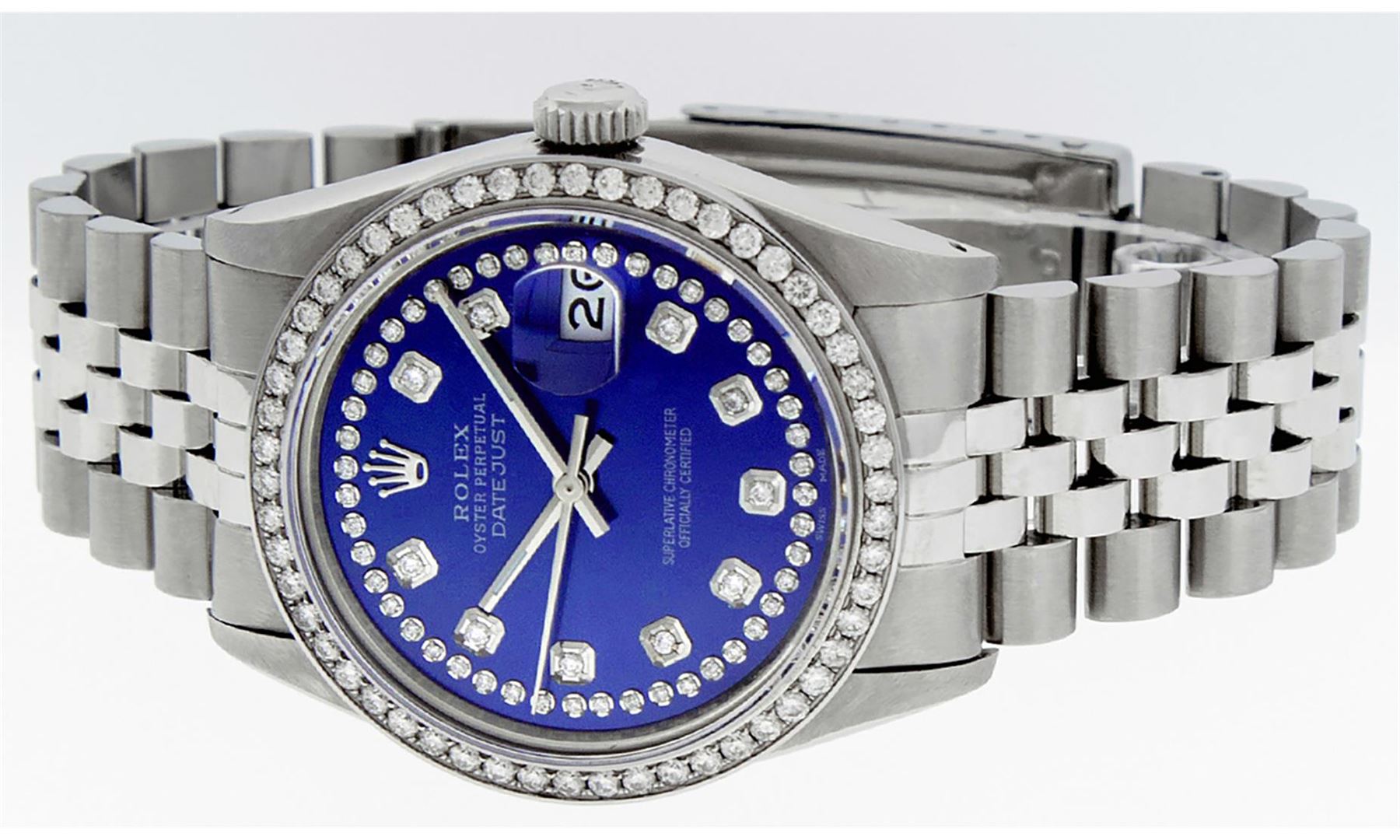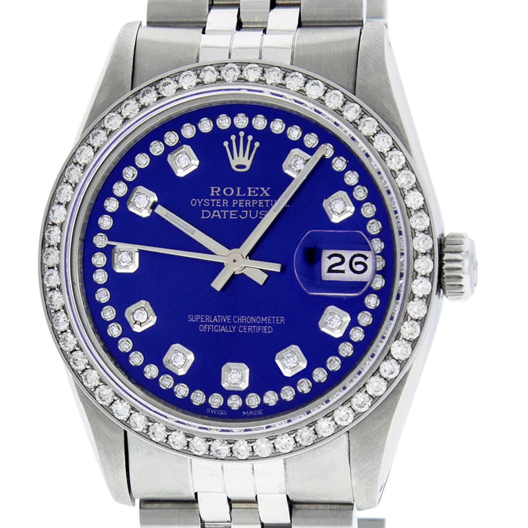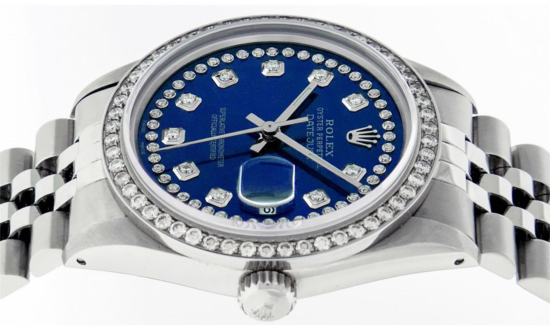 One Men's Rolex Stainless Steel Datejust Polished Bright with Satin Finish, This Watch Has Been Serviced & Electronically Tested, Stainless Steel Case: 36mm, Stainless Steel Crown, Custom Bezel: New Stainless Steel Beadset Diamond Bezel, Diamond Count: 54 Diamonds, Total Weight 1.00 Carat, Clarity: SI-VS, Color: G to H. Custom Crystal: New Synthetic Sapphire Cyclops Lens. Custom Hands: New Luminescent Hands. Movement: Automatic Winding Movement Caliber 3035. Custom Dial: Blue String Diamond Dial, Diamond Count: 58 Diamonds In Dial, Color: G to H, Clarity: VS2-SI1. Date Window: 3 O'clock Position Date Display, Quickset, Model: Datejust. Condition: G-6 Extra Fine. Bracelet: Stainless Steel Jubilee Band. Bright Polish & Satin Finish. 7.0 Inch Length, Adjustable. Standard Clasp, With Rolex Logo. This Watch Has Been Serviced Time Tested And Is In Excellent Condition It Is Free Of All Scratches And Dents.