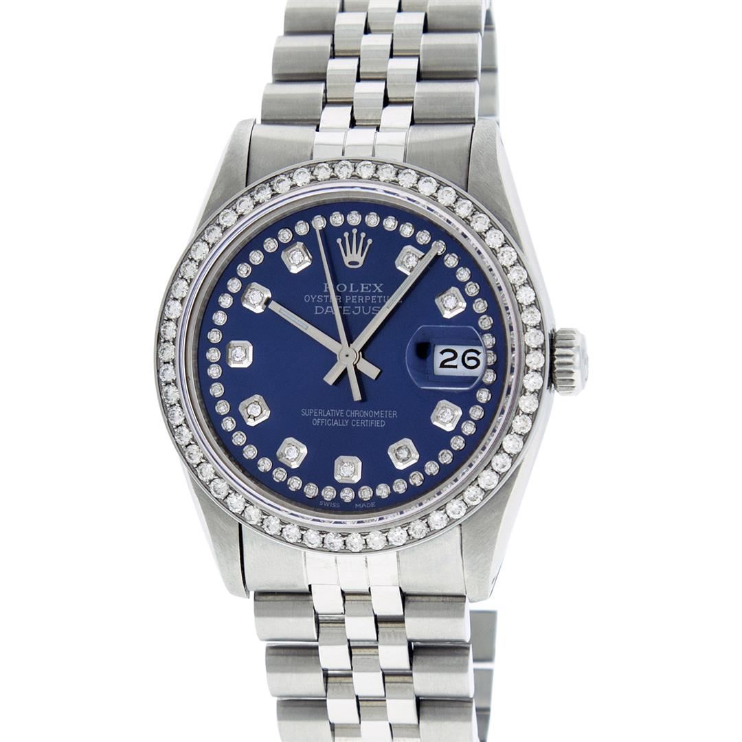 One Mens Rolex Stainless Steel Datejust Polished Bright with Satin Finish, This Watch Has Been Serviced & Electronically Tested, Stainless Steel Case: 36mm, Stainless Steel Crown, Custom Bezel: Stainless Steel Beadset Diamond Bezel, Diamond Count: 54 Diamonds, Total Weight 1.00 Carat, Clarity: SI-VS, Color: G to H. Custom Crystal: New Synthetic Sapphire Cyclops Lens. Custom Hands: New Luminescent Hands. Movement: Automatic Winding Movement Caliber 3035. Custom Dial: Blue String Diamond Dial, Diamond Count: 58 Diamonds In Dial, Color: G to H, Clarity: VS2-SI1. Date Window: 3 O'Clock Position Date Display, Quickset, Model: Datejust. Condition: G-6 Extra Fine. Bracelet: Stainless Steel Jubilee Band. Bright Polish & Satin Finish. 7.0 Inch Length, Adjustable. Standard Clasp, With Rolex Logo. This Watch Has Been Serviced Time Tested And Is In Excellent Condition It Is Free Of All Scratches And Dents.