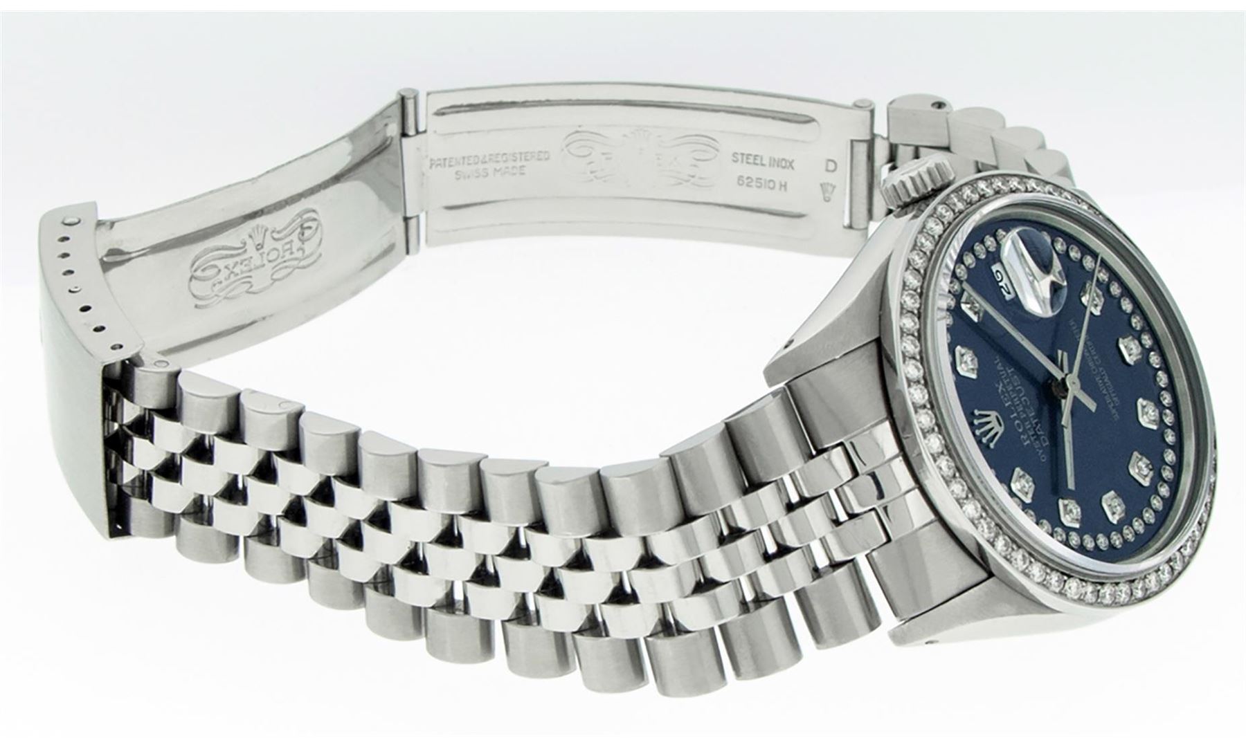 One Men's Rolex Stainless Steel Datejust Polished Bright with Satin Finish, This Watch Has Been Serviced & Electronically Tested, Stainless Steel Case: 36mm, Stainless Steel Crown, Custom Bezel: Stainless Steel Beadset Diamond Bezel, Diamond Count: 54 Diamonds, Total Weight 1.00 Carat, Clarity: SI-VS, Color: G to H. Custom Crystal: New Synthetic Sapphire Cyclops Lens. Custom Hands: New Luminescent Hands. Movement: Automatic Winding Movement. Custom Dial: Blue String Diamond Dial, Diamond Count: 58 Diamonds In Dial, Color: G to H, Clarity: VS2-SI1. Date Window: 3 O'Clock Position Date Display, Quickset, Model: Datejust. Condition: G-6 Extra Fine. Bracelet: Stainless Steel Jubilee Band. Bright Polish & Satin Finish. 7.0 Inch Length, Adjustable. Standard Clasp, With Rolex Logo. This Watch Has Been Serviced Time Tested And Is In Excellent Condition It Is Free Of All Scratches And Dents.