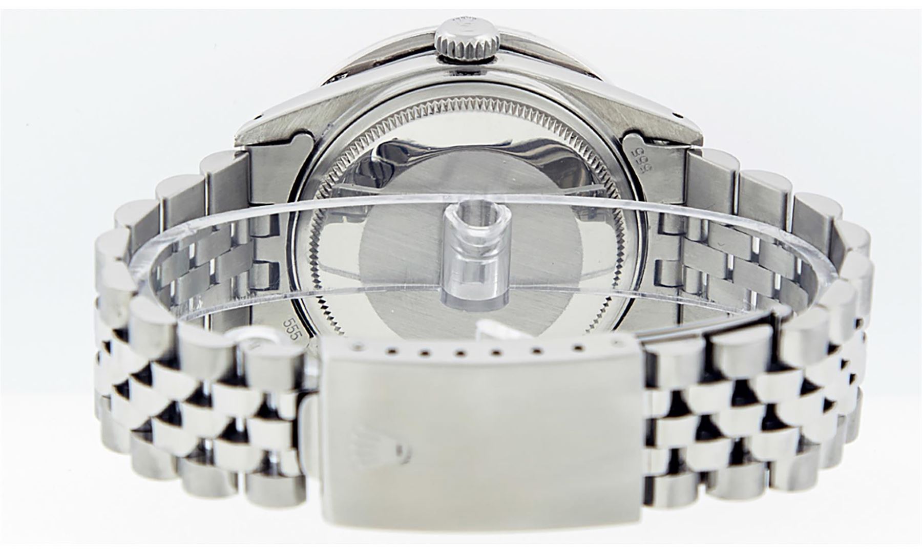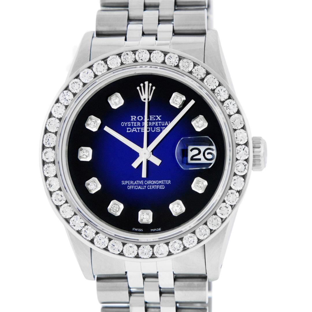 One Men's Stainless Steel Rolex Datejust Polished Bright with Satin Finish, Fully Serviced & Electronically Tested, Stainless Steel Case:36mm, Stainless Steel Crown, Custom Bezel: 18K White Gold 3.00 Ctw Diamond Bezel, Diamond Count: 40 Diamonds, Total Weight 3.0 Carat, Clarity: SI-VS, Color: G to H. Custom Crystal: New Synthetic Sapphire Cyclops Lens. Custom Hands: New Luminescent Hands. Movement: Automatic Winding Movement Caliber 3035. Custom Dial: Blue Vignette Diamond Dial, 10 Diamonds in Dial, G To H In Color, Clarity: SI-VS. Date Window: 3 O'clock Position Date Display, Quickset, Model: Datejust 36mm, Condition: G-6 Extra Fine. Bracelet: Rolex Stainless Steel Jubilee Band. Bright Polish & Satin Finish. 7.0 Inch Length, Adjustable. Standard Clasp, With Rolex Logo. Watch Has Been Serviced And Polished It Is Free Of All Scratches And Dents.