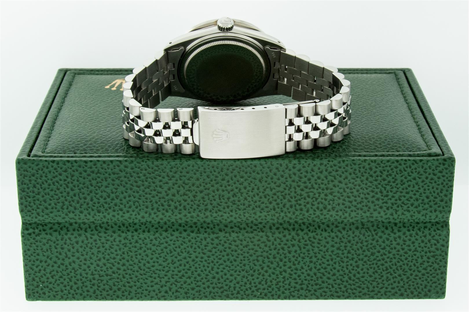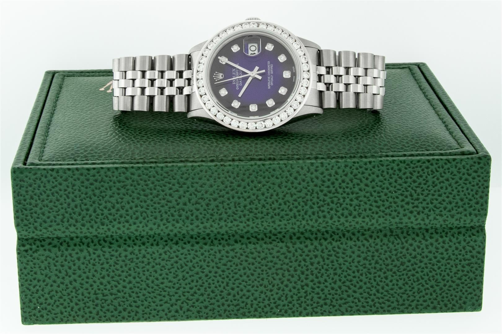 One Men's Stainless Steel Rolex Datejust Polished Bright with Satin Finish, Fully Serviced & Electronically Tested, Stainless Steel Case: 36mm, Rolex Stainless Steel Crown, Custom Bezel: New 18K White Gold 3.00 Ctw Diamond Bezel, Diamond Count: 40 Diamonds, Total Weight 3.0 Carat, Clarity: SI-VS, Color: G to H. Custom Crystal: New Sapphire With Magnified Date Window. Custom Hands: New Luminescent Hands. Rolex Movement: Automatic Winding Movement. Custom Dial: Refinished To Blue Vignette With Added Diamond Hour Markers, 10 Diamonds in Dial, G To H In Color, Clarity: SI-VS. Date Window: 3 O'clock Position Date Display, Quickset, Model: Datejust 36mm, Condition: G-6 Extra Fine. Rolex Bracelet: Rolex Stainless Steel Jubilee Band. Bright Polish & Satin Finish. 7.0 Inch Length, Adjustable. Standard Clasp, With Rolex Logo. This Pre Owned Watch Has Been Serviced And Polished It Is Free Of All Scratches And Dents. This Watch Comes With A Rolex Box.