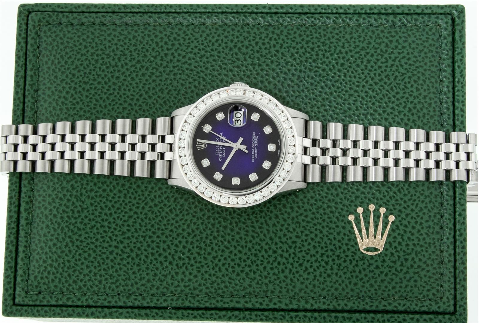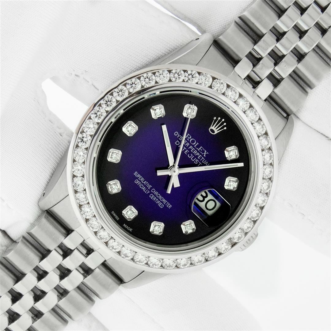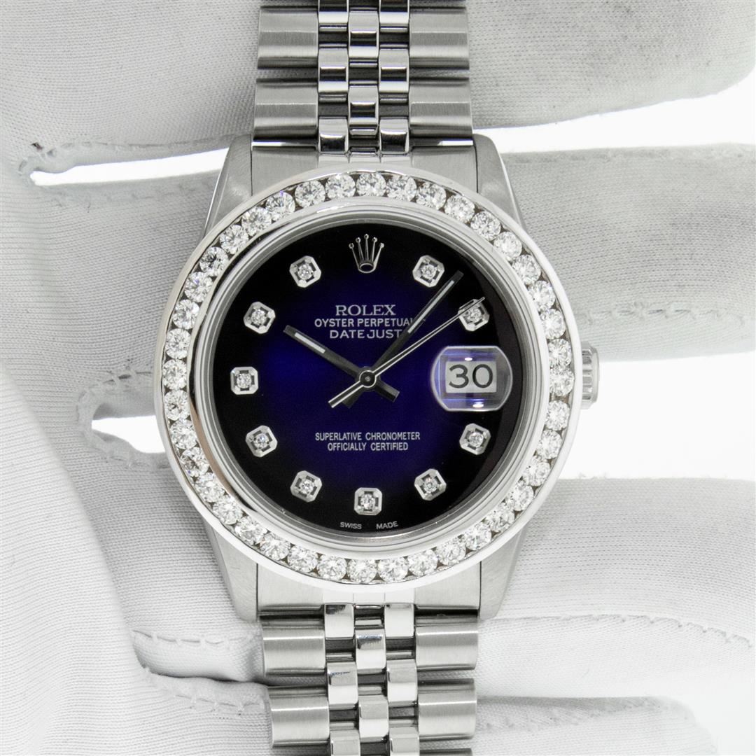 One Men's Stainless Steel Rolex Datejust Polished Bright with Satin Finish, Fully Serviced & Electronically Tested, Stainless Steel Case: 36mm, Rolex Stainless Steel Crown, Custom Bezel: New 18K White Gold 3.00 Ctw Diamond Bezel, Diamond Count: 40 Diamonds, Total Weight 3.0 Carat, Clarity: SI-VS, Color: G to H. Custom Crystal: New Sapphire With Magnified Date Window. Custom Hands: New Luminescent Hands. Rolex Movement: Automatic Winding Movement. Custom Dial: Refinished To Blue Vignette With Added Diamond Hour Markers, 10 Diamonds in Dial, G To H In Color, Clarity: SI-VS. Date Window: 3 O'clock Position Date Display, Quickset, Model: Datejust 36mm, Condition: G-6 Extra Fine. Rolex Bracelet: Rolex Stainless Steel Jubilee Band. Bright Polish & Satin Finish. 7.0 Inch Length, Adjustable. Standard Clasp, With Rolex Logo. This Pre Owned Watch Has Been Serviced And Polished It Is Free Of All Scratches And Dents. This Watch Comes With A Rolex Box.