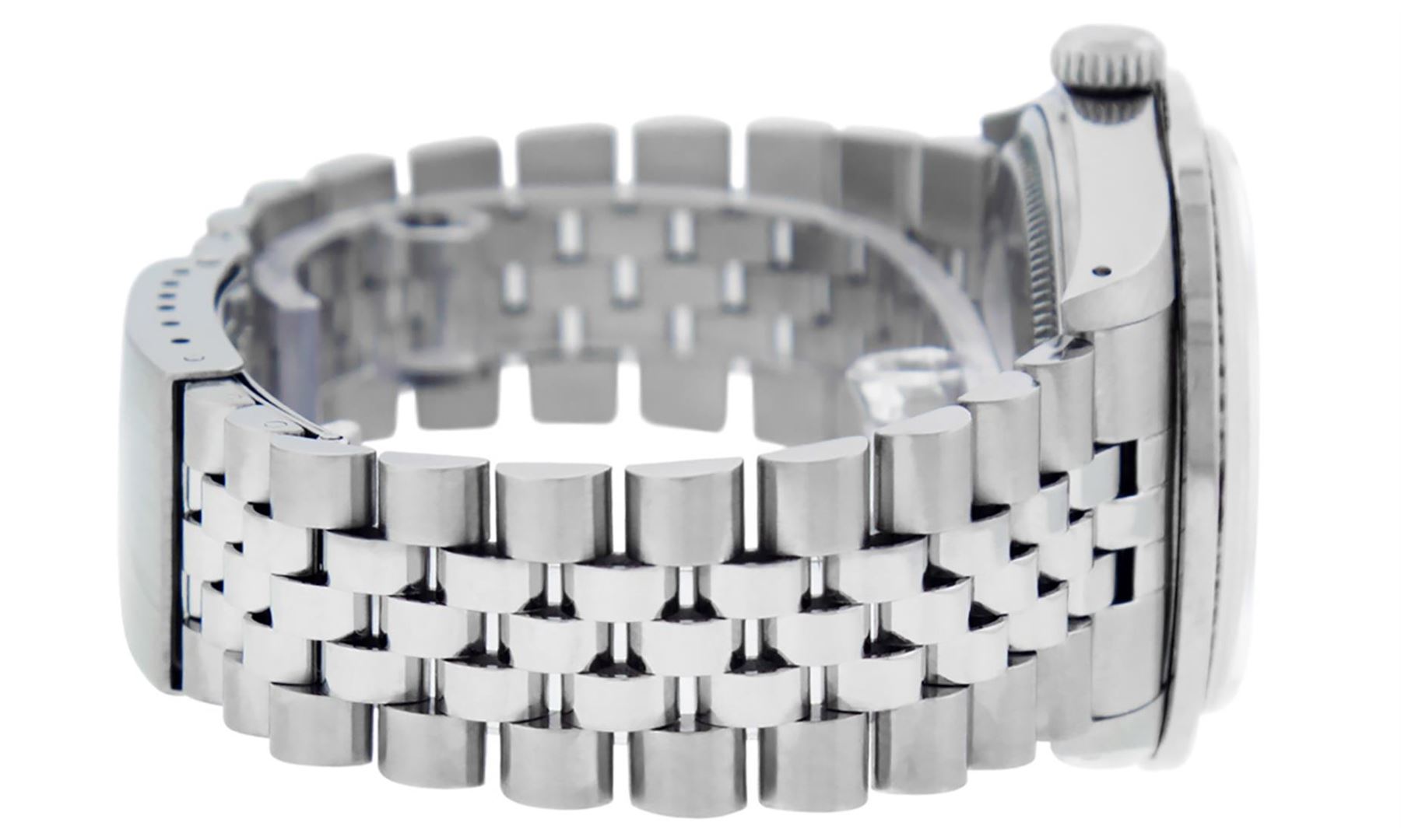 One Men's Stainless Steel Rolex Datejust Polished Bright with Satin Finish, This Watch Has Been Serviced & Electronically Tested, Stainless Steel Case: 36mm, Stainless Steel Crown, Custom Bezel: New 18K White Gold Ruby Channel Set Diamond Bezel, Diamond + Gem Count: 52 Diamonds + 4 Rubies, Total Weight 1.30 Carat, Clarity: SI-VS, Color: G to H. Custom Crystal: New Synthetic Sapphire Cyclops Lens. Custom Hands: New Luminescent Hands. Movement: Automatic Winding Movement Caliber 3035. Custom Dial: Blue Vignette Diamond Dial, Diamond Count: 10 Diamonds in Dial, Diamond Color: G To H In Color, Clarity: SI-VS. Date Window: 3 O'clock Position Date Display, Quickset, Model: Datejust, Condition: G-6 Extra Fine. Bracelet: Stainless Steel Jubilee. Bracelet: 7.0 Inch Length, Adjustable. Standard Clasp, With Rolex Logo. This Watch Has Been Serviced Time Tested And Is In Excellent Condition It Is Free Of All Scratches And Dents.