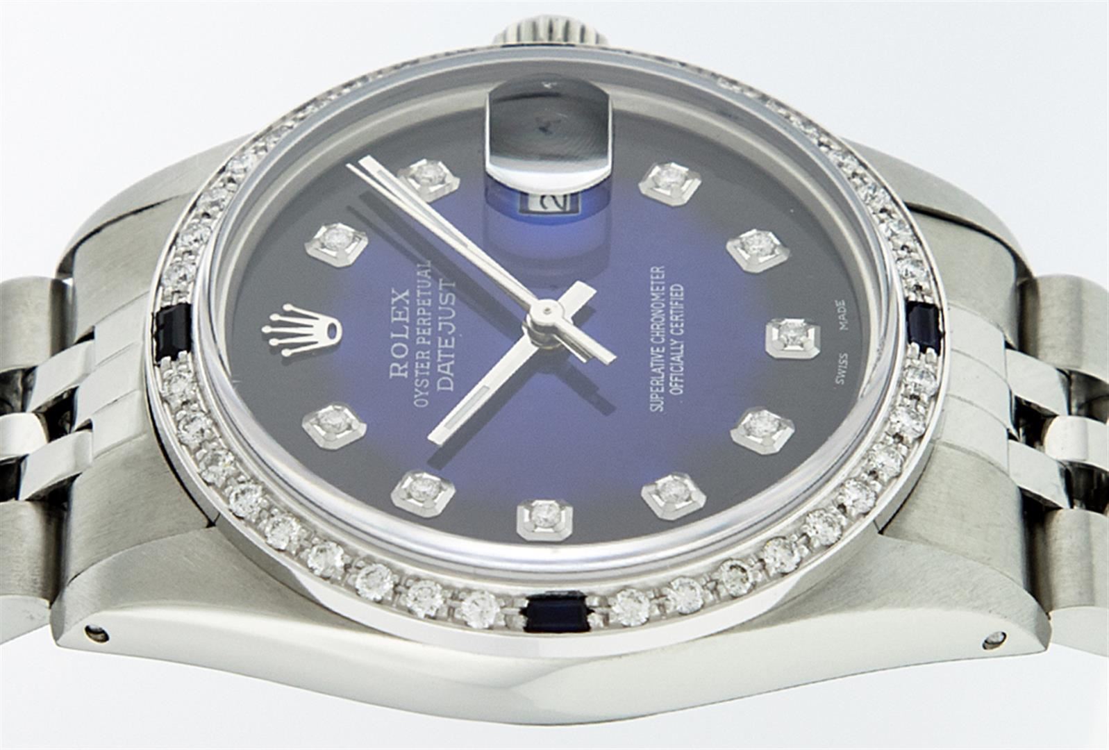 One Mens Rolex Datejust Polished Bright with Satin Finish, This Watch Has Been Serviced & Electronically Tested, Stainless Steel Case: 36mm, Stainless Steel Crown, Custom Bezel: New 18K White Gold Sapphire Beadset Diamond Bezel, Diamond + Gem Count: 36 Diamonds + 4 Sapphires Total Weight 1.00 Carat, Clarity: Si-VS, Color: G to H. Custom Crystal: New Synthetic Sapphire Cyclops Lens. Custom Hands: New Luminescent Hands. Movement: Automatic Winding Movement Caliber 3035. Custom Dial: Blue Vignette With Diamond Hour Markers, Diamond Count: 10 Diamonds in Dial, Diamond Color: G To H In Color, Clarity: Si-VS. Date Window: 3 O'Clock Position Date Display, Quickset, Model: Datejust, Condition: G-6 Extra Fine. Bracelet: Stainless Steel Jubilee. Bracelet: 7.0 Inch Length, Adjustable. Standard Clasp, With Rolex Logo. This Watch Has Been Serviced Time Tested And Is In Excellent Condition It Is Free Of All Scratches And Dents.