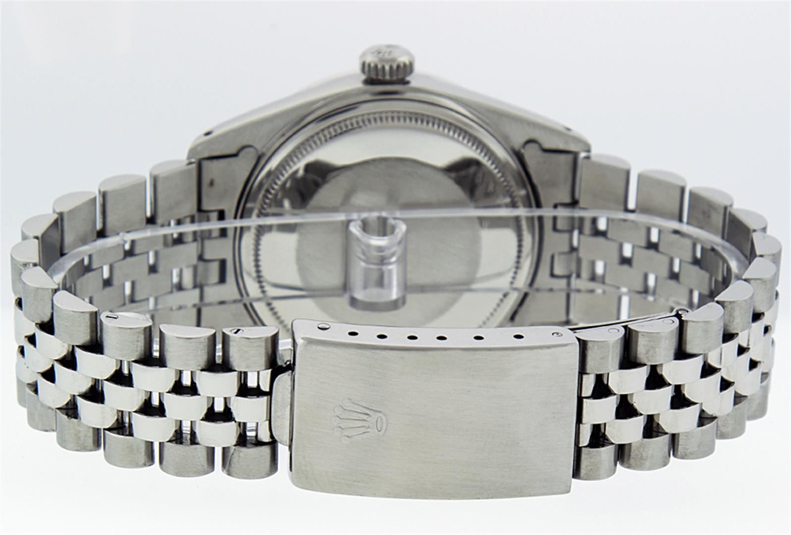 One Mens Rolex Datejust Polished Bright with Satin Finish, This Watch Has Been Serviced & Electronically Tested, Stainless Steel Case: 36mm, Stainless Steel Crown, Custom Bezel: New 18K White Gold Sapphire Beadset Diamond Bezel, Diamond + Gem Count: 36 Diamonds + 4 Sapphires Total Weight 1.00 Carat, Clarity: Si-VS, Color: G to H. Custom Crystal: New Synthetic Sapphire Cyclops Lens. Custom Hands: New Luminescent Hands. Movement: Automatic Winding Movement Caliber 3035. Custom Dial: Blue Vignette With Diamond Hour Markers, Diamond Count: 10 Diamonds in Dial, Diamond Color: G To H In Color, Clarity: Si-VS. Date Window: 3 O'Clock Position Date Display, Quickset, Model: Datejust, Condition: G-6 Extra Fine. Bracelet: Stainless Steel Jubilee. Bracelet: 7.0 Inch Length, Adjustable. Standard Clasp, With Rolex Logo. This Watch Has Been Serviced Time Tested And Is In Excellent Condition It Is Free Of All Scratches And Dents.