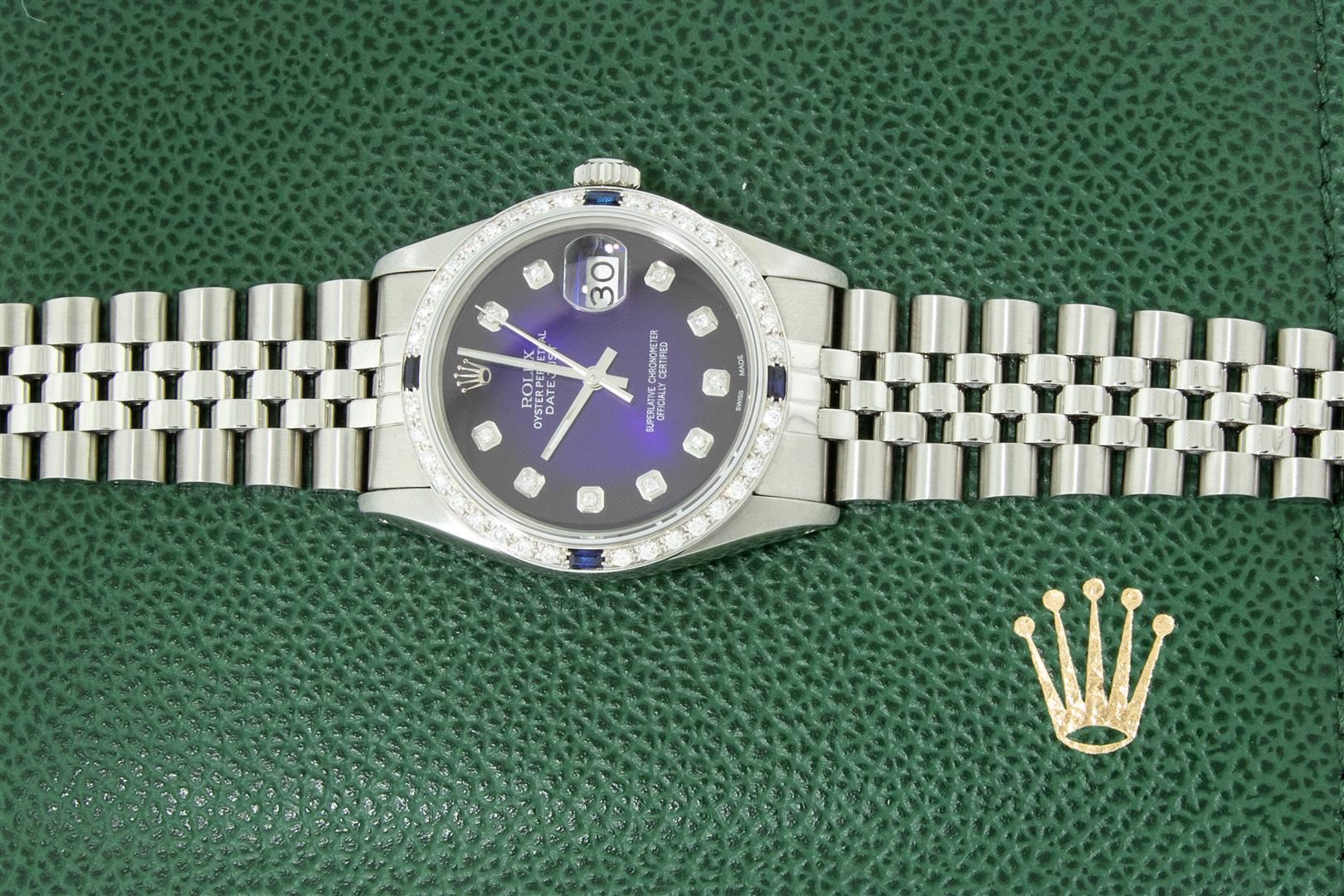 One Men's Rolex Datejust Polished Bright with Satin Finish, This Watch Has Been Serviced & Electronically Tested, Rolex Stainless Steel Case: 36mm, Rolex Stainless Steel Crown, Custom Bezel: New 18K White Gold Sapphire Beadset Diamond Bezel, Diamond + Gem Count: 36 Diamonds + 4 Sapphires Total Weight 1.00 Carat, Clarity: SI-VS, Color: G to H. Custom Crystal: New Sapphire With Cyclops Lens. Custom Hands: New Luminescent Hands. Rolex Movement: Automatic Winding Movement. Custom Dial: Refinished To Blue Vignette With Added Diamond Hour Markers, Diamond Count: 10 Diamonds in Dial, Diamond Color: G To H In Color, Clarity: SI-VS. Date Window: 3 O'clock Position Date Display, Quickset, Model: Datejust, Condition: G-6 Extra Fine. Rolex Bracelet: Stainless Steel Jubilee Band. Bracelet: 7.0 Inch Length, Adjustable. Standard Clasp, With Rolex Logo. This Pre Owned Watch Has Been Serviced Time Tested And Is In Excellent Condition It Is Free Of All Scratches And Dents. This Watch Comes With A Rolex Box.