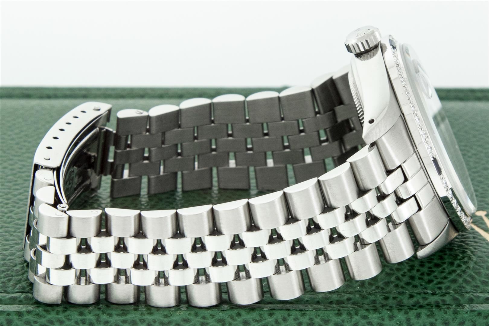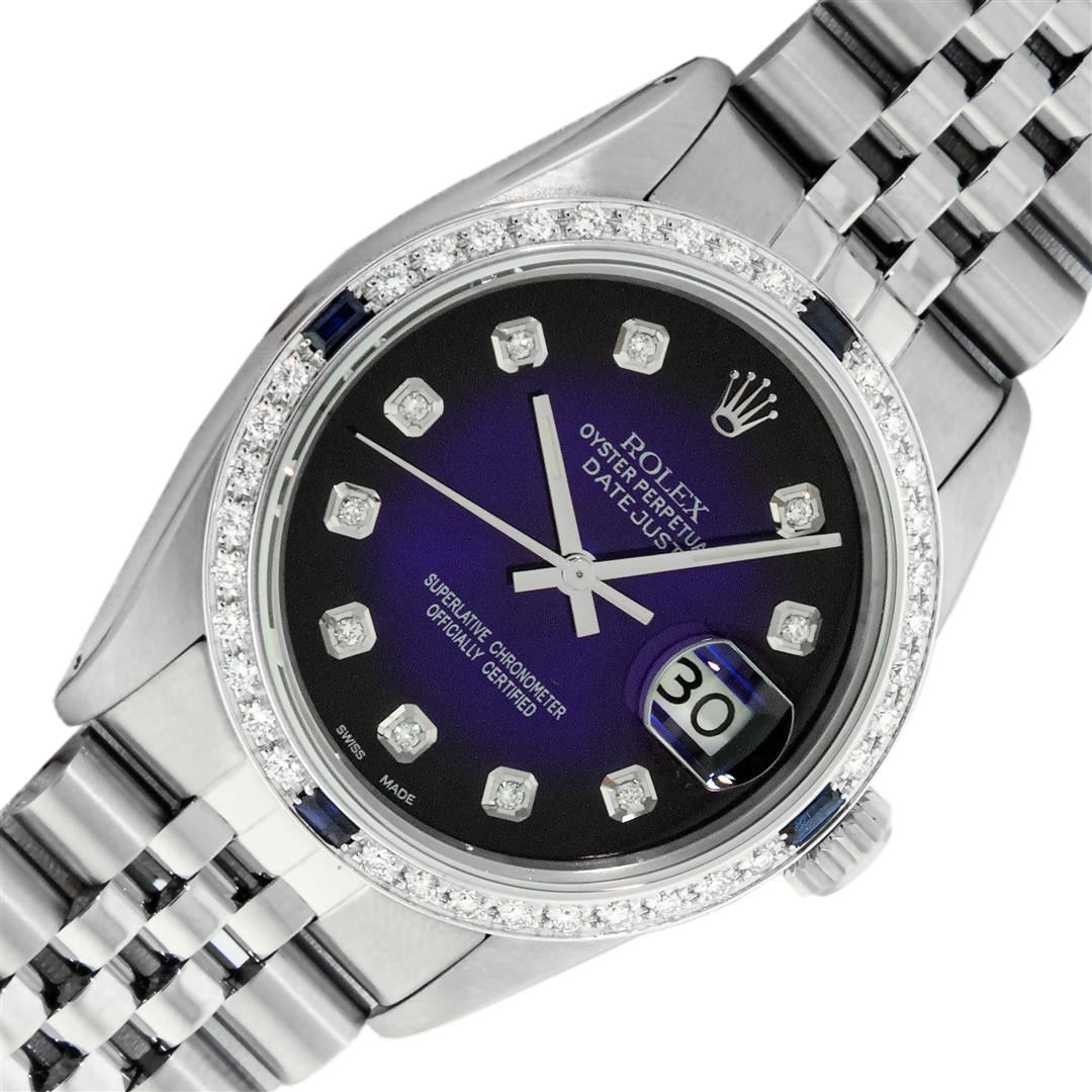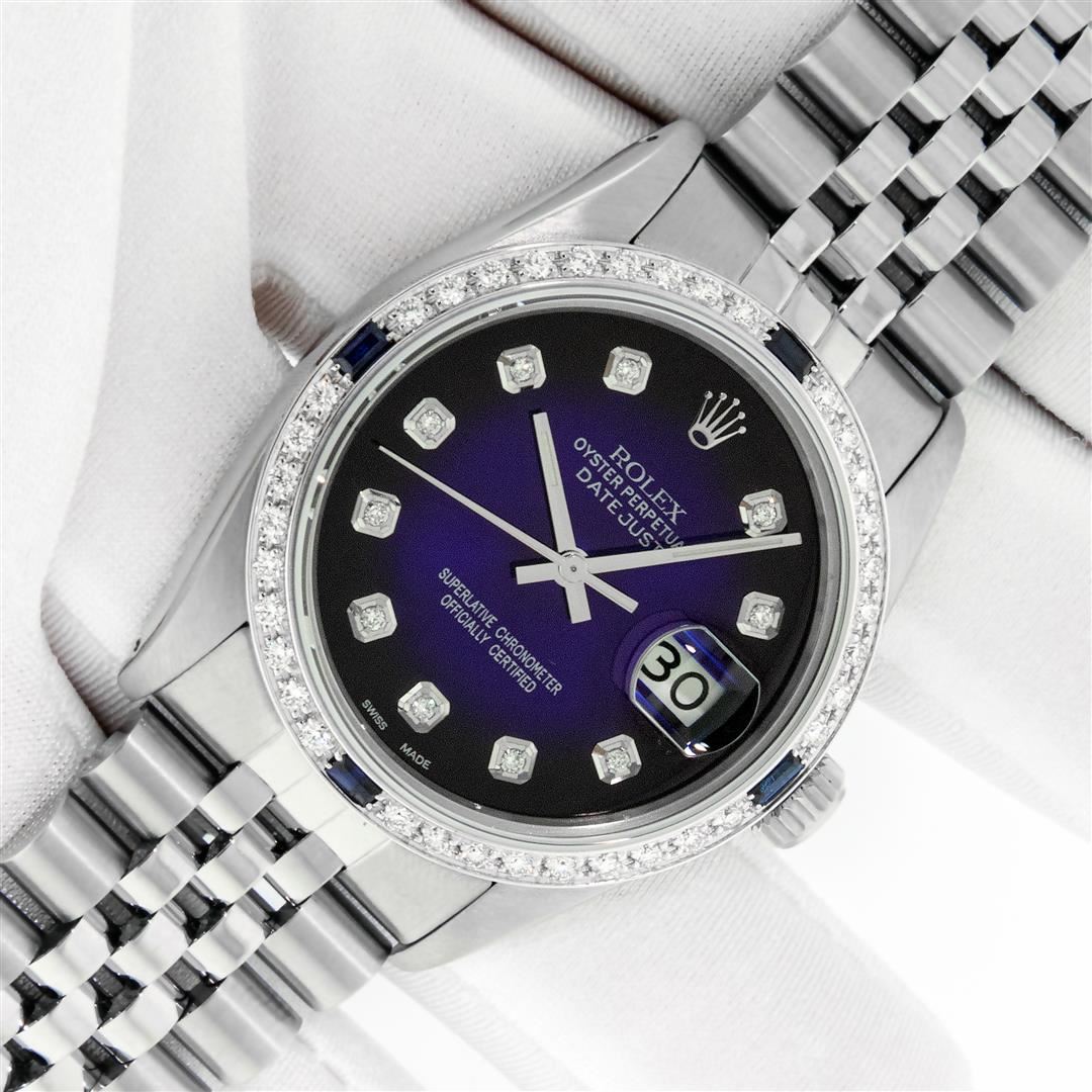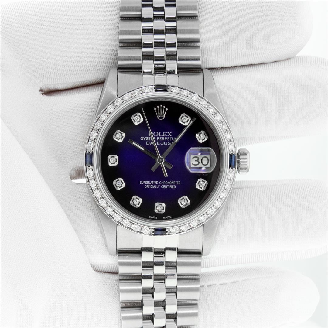 One Men's Rolex Datejust Polished Bright with Satin Finish, This Watch Has Been Serviced & Electronically Tested, Rolex Stainless Steel Case: 36mm, Rolex Stainless Steel Crown, Custom Bezel: New 18K White Gold Sapphire Beadset Diamond Bezel, Diamond + Gem Count: 36 Diamonds + 4 Sapphires Total Weight 1.00 Carat, Clarity: SI-VS, Color: G to H. Custom Crystal: New Sapphire With Cyclops Lens. Custom Hands: New Luminescent Hands. Rolex Movement: Automatic Winding Movement. Custom Dial: Refinished To Blue Vignette With Added Diamond Hour Markers, Diamond Count: 10 Diamonds in Dial, Diamond Color: G To H In Color, Clarity: SI-VS. Date Window: 3 O'clock Position Date Display, Quickset, Model: Datejust, Condition: G-6 Extra Fine. Rolex Bracelet: Stainless Steel Jubilee Band. Bracelet: 7.0 Inch Length, Adjustable. Standard Clasp, With Rolex Logo. This Pre Owned Watch Has Been Serviced Time Tested And Is In Excellent Condition It Is Free Of All Scratches And Dents. This Watch Comes With A Rolex Box.