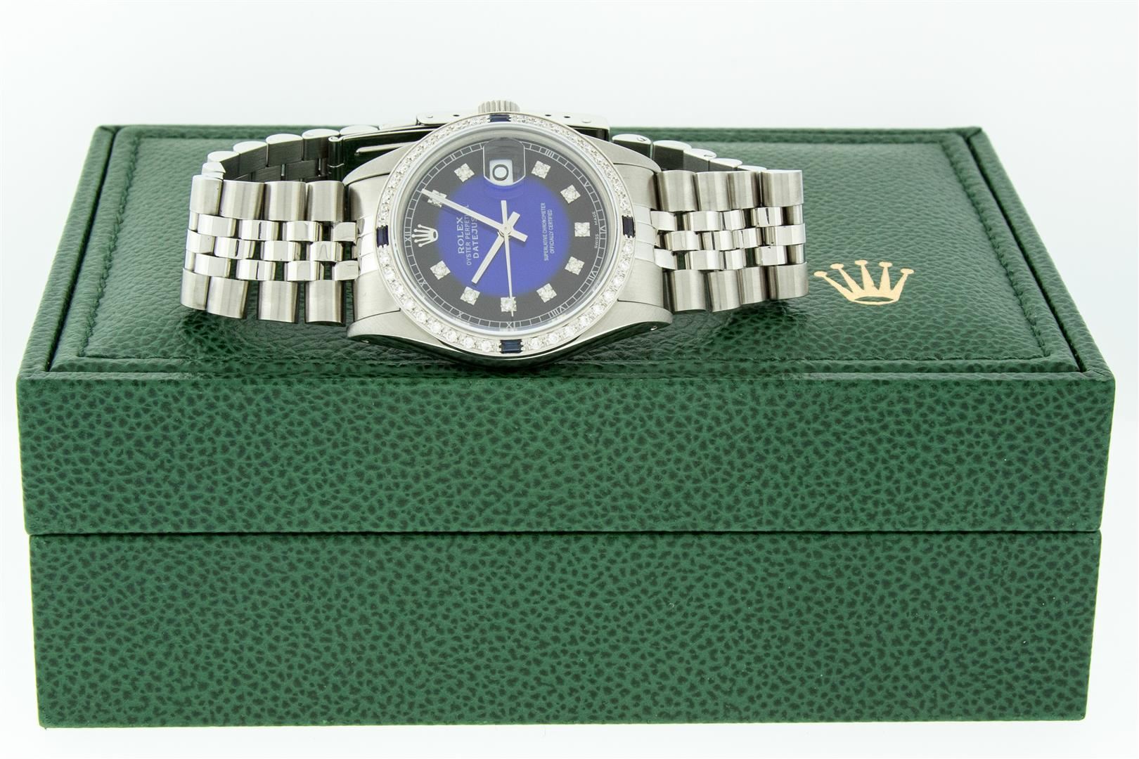 One Men's Stainless Steel Rolex Datejust Polished, Serviced & Electronically Tested, Rolex Stainless Steel Case: 36mm, Rolex Stainless Steel Crown, Custom Bezel: New 18K White Gold Sapphire Beadset Diamond Bezel, Diamond + Gem Count: 36 Diamonds + 4 Sapphires Total Weight 1.00 Carat, Clarity: SI-VS, Color: G to H. Custom Crystal: New Sapphire With Magnified Date Window. Custom Hands: New Luminescent Hands. Rolex Movement: Automatic Winding Movement. Custom Dial: Refinished To Blue With Added Diamond Hour Markers, 10 Diamonds in Dial, G To H In Color, Clarity: SI-VS. Date Window: 3 O'clock Position Date Display, Quickset, Model: Datejust. Condition: G-6 Extra Fine. Rolex Bracelet: Stainless Steel Jubilee Band. Bright Polish & Satin Finish. 7.0 Inch Length, Adjustable. Standard Clasp, With Rolex Logo. This Pre Owned Watch Has Been Serviced Time Tested And Is In Excellent Condition It Is Free Of All Scratches And Dents. This Watch Comes With A Rolex Box.