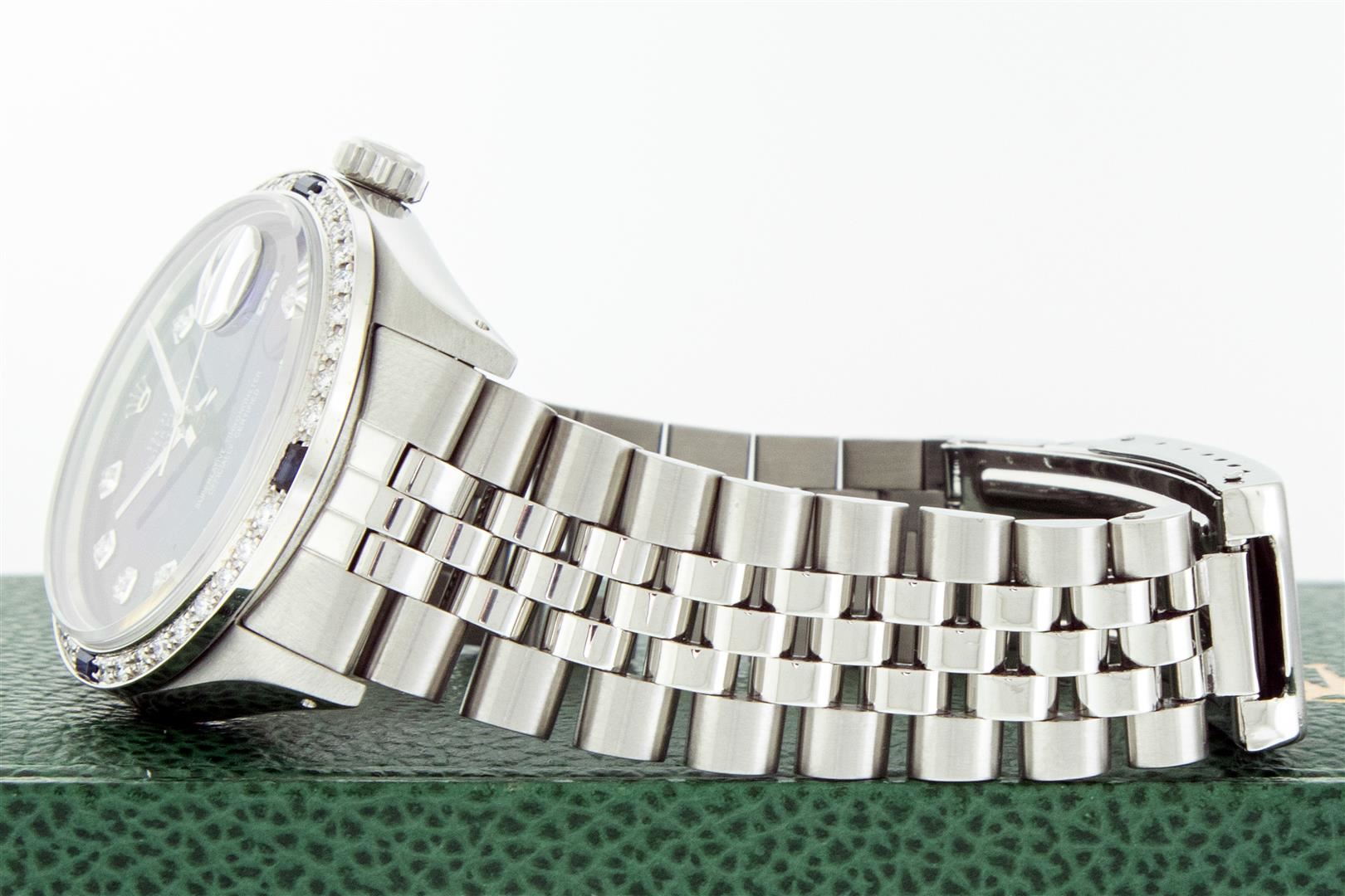 One Men's Rolex Datejust Polished Bright with Satin Finish, This Watch Has Been Serviced & Electronically Tested, Rolex Stainless Steel Case: 36mm, Rolex Stainless Steel Crown, Custom Bezel: New 18K White Gold Sapphire Beadset Diamond Bezel, Diamond + Gem Count: 36 Diamonds + 4 Sapphires Total Weight 1.00 Carat, Clarity: SI-VS, Color: G to H. Custom Crystal: New Sapphire With Cyclops Lens. Custom Hands: New Luminescent Hands. Rolex Movement: Automatic Winding Movement. Custom Dial: Refinished To Blue Vignette With Added Diamond Hour Markers, Diamond Count: 10 Diamonds in Dial, Diamond Color: G To H In Color, Clarity: SI-VS. Date Window: 3 O'clock Position Date Display, Quickset, Model: Datejust, Condition: G-6 Extra Fine. Rolex Bracelet: Stainless Steel Jubilee Band. Bracelet: 7.0 Inch Length, Adjustable. Standard Clasp, With Rolex Logo. This Pre Owned Watch Has Been Serviced Time Tested And Is In Excellent Condition It Is Free Of All Scratches And Dents. This Watch Comes With A Rolex Box.