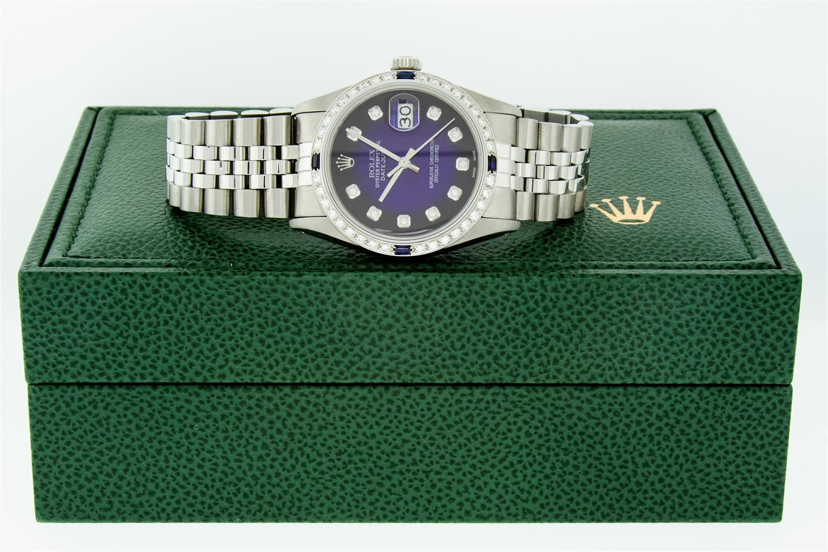 One Men's Rolex Datejust Polished Bright with Satin Finish, This Watch Has Been Serviced & Electronically Tested, Rolex Stainless Steel Case: 36mm, Rolex Stainless Steel Crown, Custom Bezel: New 18K White Gold Sapphire Beadset Diamond Bezel, Diamond + Gem Count: 36 Diamonds + 4 Sapphires Total Weight 1.00 Carat, Clarity: SI-VS, Color: G to H. Custom Crystal: New Sapphire With Cyclops Lens. Custom Hands: New Luminescent Hands. Rolex Movement: Automatic Winding Movement. Custom Dial: Refinished To Blue Vignette With Added Diamond Hour Markers, Diamond Count: 10 Diamonds in Dial, Diamond Color: G To H In Color, Clarity: SI-VS. Date Window: 3 O'clock Position Date Display, Quickset, Model: Datejust, Condition: G-6 Extra Fine. Rolex Bracelet: Stainless Steel Jubilee Band. Bracelet: 7.0 Inch Length, Adjustable. Standard Clasp, With Rolex Logo. This Pre Owned Watch Has Been Serviced Time Tested And Is In Excellent Condition It Is Free Of All Scratches And Dents. This Watch Comes With A Rolex Box.