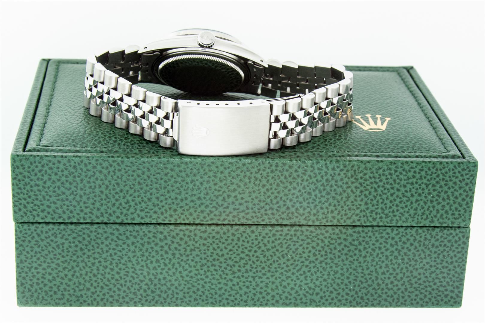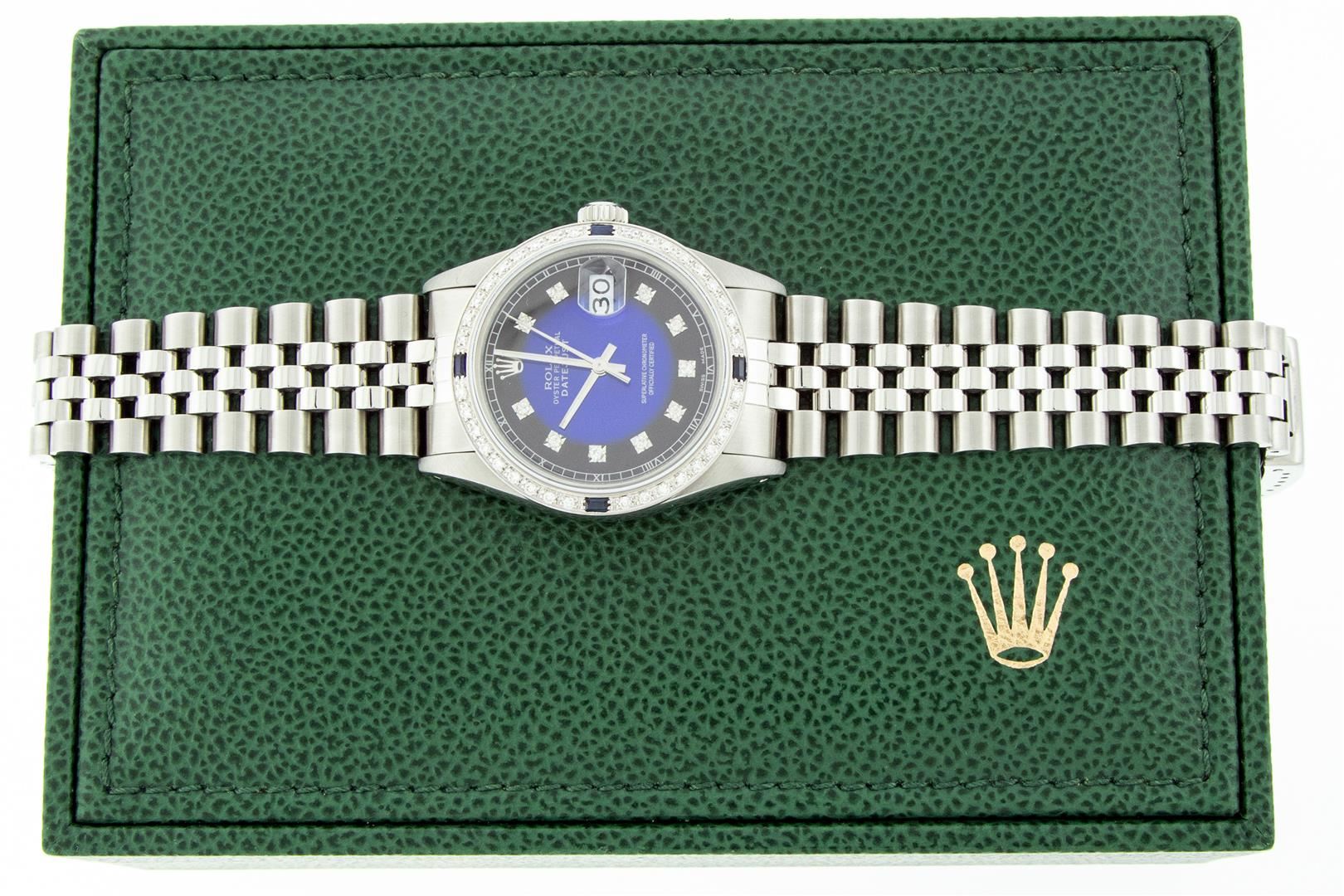 One Men's Stainless Steel Rolex Datejust Polished, Serviced & Electronically Tested, Rolex Stainless Steel Case: 36mm, Rolex Stainless Steel Crown, Custom Bezel: New 18K White Gold Sapphire Beadset Diamond Bezel, Diamond + Gem Count: 36 Diamonds + 4 Sapphires Total Weight 1.00 Carat, Clarity: SI-VS, Color: G to H. Custom Crystal: New Sapphire With Magnified Date Window. Custom Hands: New Luminescent Hands. Rolex Movement: Automatic Winding Movement. Custom Dial: Refinished To Blue With Added Diamond Hour Markers, 10 Diamonds in Dial, G To H In Color, Clarity: SI-VS. Date Window: 3 O'clock Position Date Display, Quickset, Model: Datejust. Condition: G-6 Extra Fine. Rolex Bracelet: Stainless Steel Jubilee Band. Bright Polish & Satin Finish. 7.0 Inch Length, Adjustable. Standard Clasp, With Rolex Logo. This Pre Owned Watch Has Been Serviced Time Tested And Is In Excellent Condition It Is Free Of All Scratches And Dents. This Watch Comes With A Rolex Box.