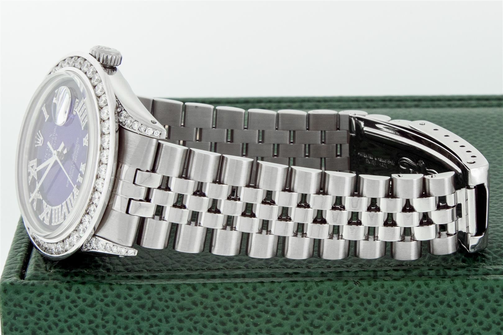 One Men's Stainless Steel Rolex Datejust Polished Bright with Satin Finish, Serviced & Electronically Tested, Rolex Stainless Steel Case: 36mm, Diamond Lugs: 24 Diamonds On Lugs, Color: G to H, Clarity: SI-VS. Rolex Stainless Steel Crown, New Custom Bezel: 18K White Gold 3.00 Ctw Diamond Bezel, Diamond Count: 40 Diamonds, Total Weight 3.0 Carat, Clarity: SI-VS, Color: G to H. Custom Crystal: New Sapphire With Magnified Date Window. Rolex Movement: Automatic Winding Movement. Custom Dial: Refinished To Blue Vignette With Added Roman Diamond Hour Markers, Diamond Color: G To H In Color, Clarity: SI-VS. Date Window: 3 O'clock Position Date Display, Quickset, Model: Quickset Datejust, Condition: G-6 Extra Fine. Rolex Bracelet: Stainless Steel Jubilee Band. Bright Polish & Satin Finish. 7.0 Inch Length, Adjustable. Standard Clasp, With Rolex Logo. This Pre Owned Watch Has Been Serviced Time Tested And Is In Excellent Condition It Is Free Of All Scratches And Dents. This Watch Comes With A Rolex Box.