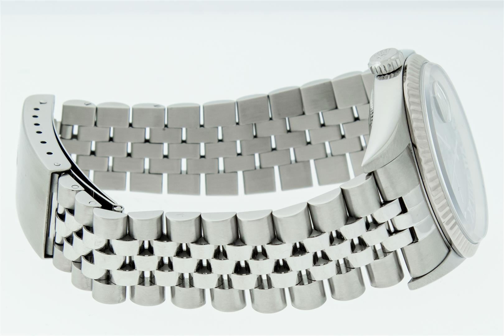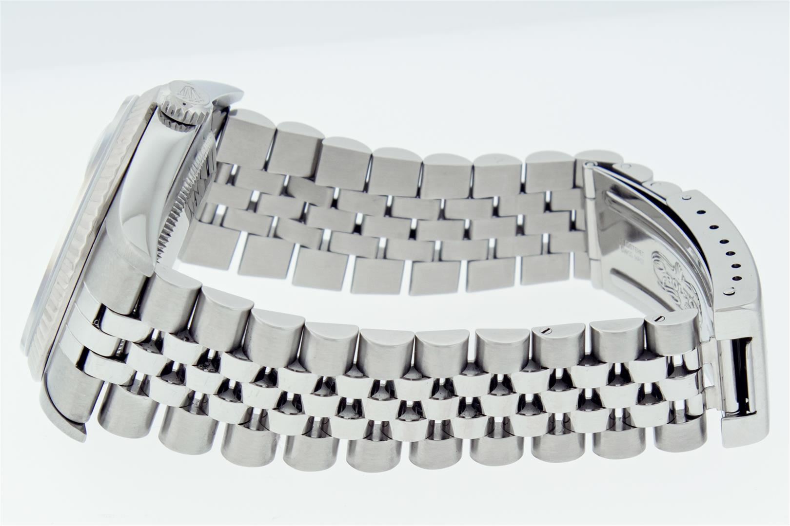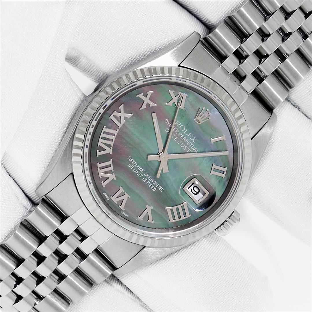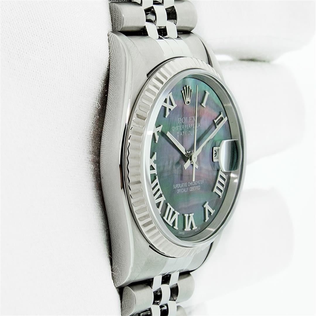 One Men's Stainless Steel Rolex Datejust Polished Bright with Satin Finish, This Watch Has Been Serviced & Electronically Tested, Stainless Steel Case: 36mm, Rolex Stainless Steel Crown, Rolex Bezel: White Gold Fluted Bezel. Custom Crystal: New Sapphire With Magnified Date Window. Custom Hands: New Luminescent Hands. Rolex Movement: Automatic Winding Movement Caliber 3135. Custom Dial: Tahitian MOP Dial With Roman Numerical Hour Markers. Date Window: 3 O'clock Position Date Display, Quickset, Model: Datejust, Condition: G-6 Extra Fine. Rolex Bracelet: Stainless Steel Jubilee Band. Bright Polish & Satin Finish. 7.0 Inch Length, Adjustable. Standard Clasp, With Rolex Logo. This Pre Owned Watch Has Been Serviced Time Tested And Is In Excellent Condition It Is Free Of All Scratches And Dents.